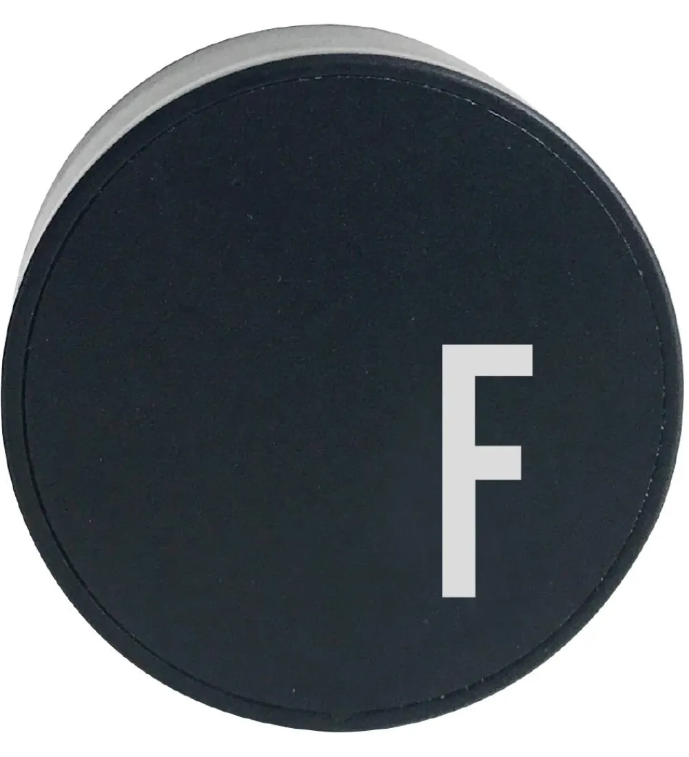 Flot Design Letters adapter i sort med et personligt, hvidt print af bogstavet “F” på fronten.