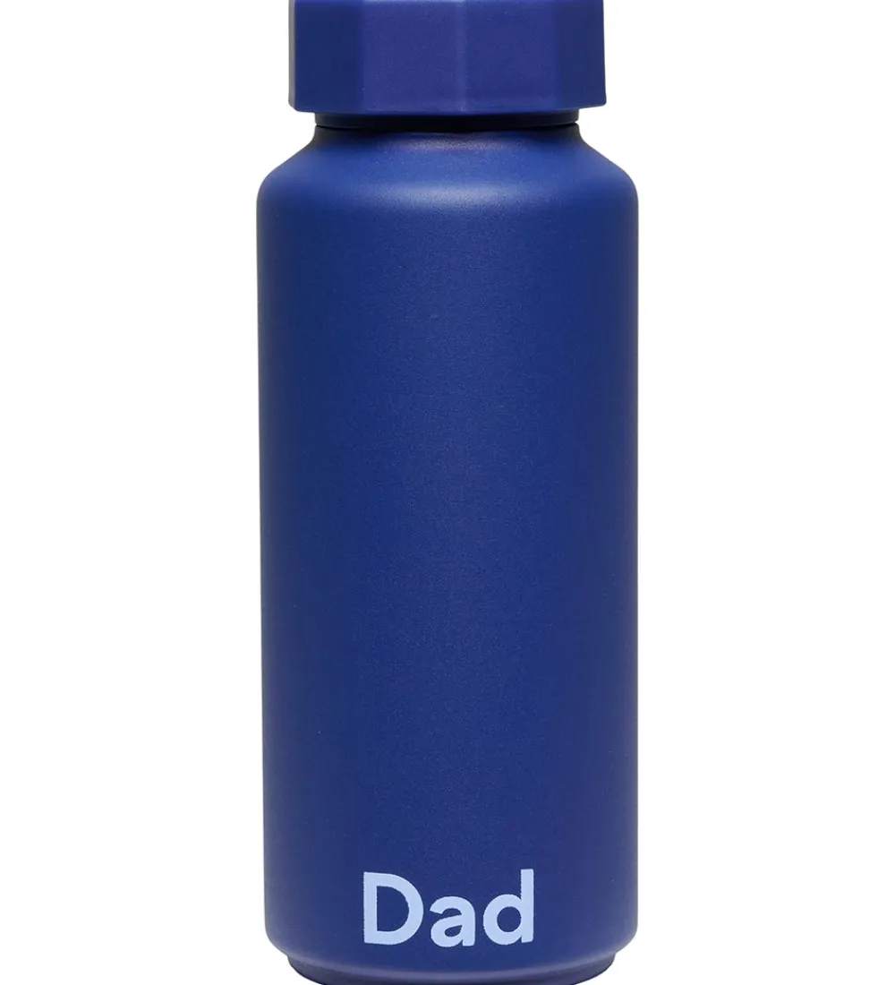 Lækker Design Letters termoflaske i mørkeblå, og nederst står der “Dad” med lyseblå bogstaver.