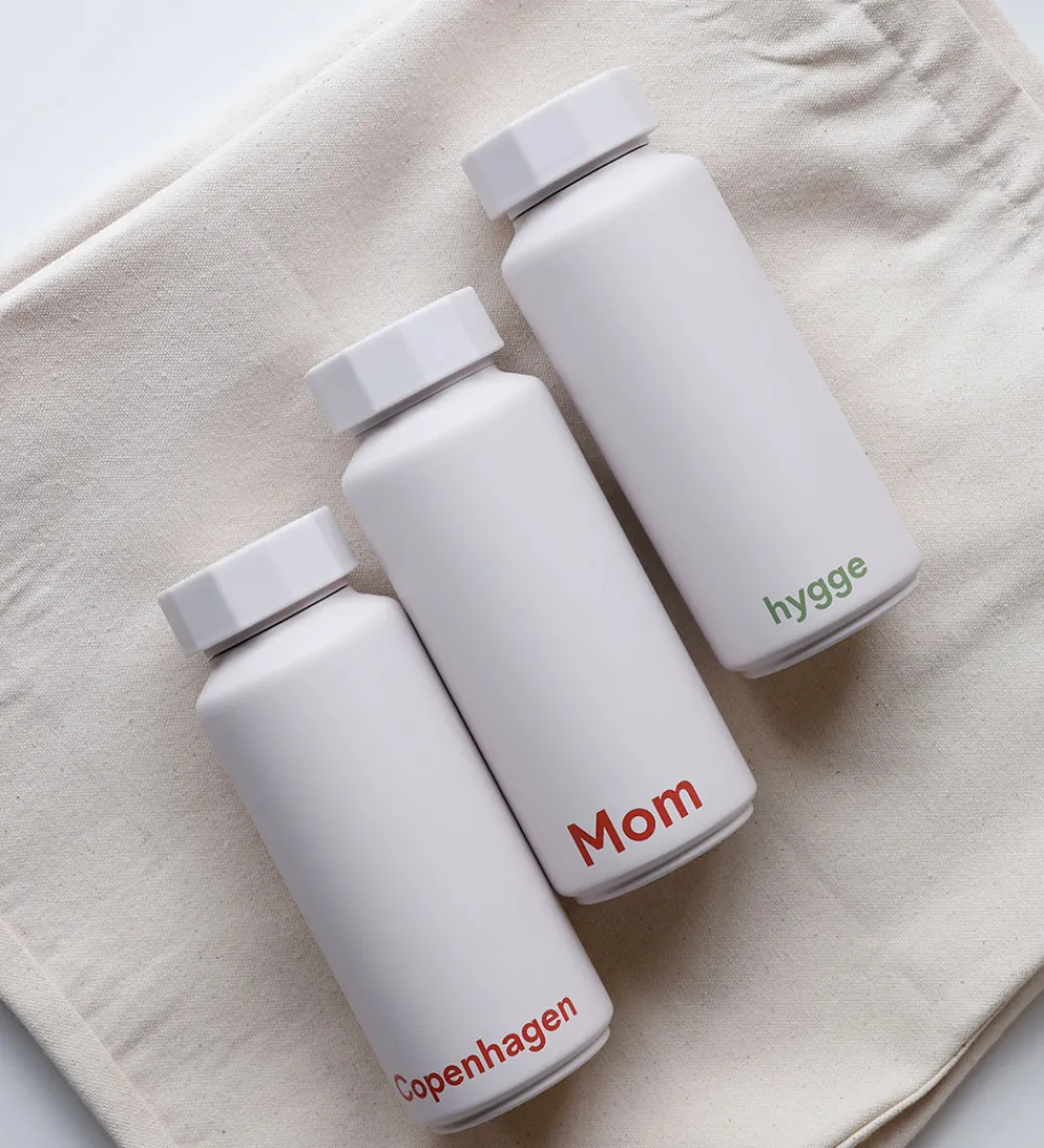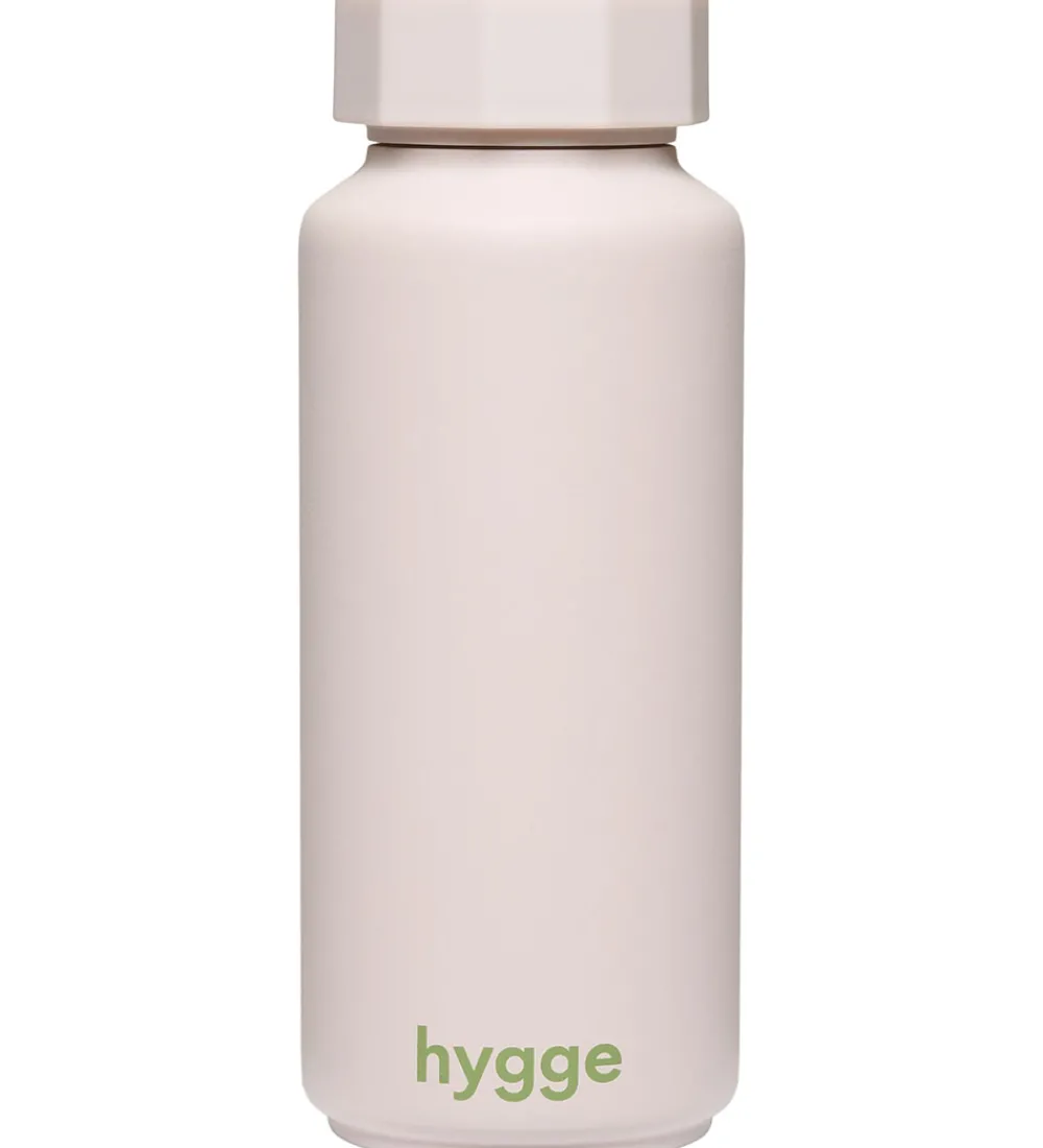 Sød Design Letters termoflaske i lys pudderrosa, og nederst står der “Hygge” med grønne bogstaver.