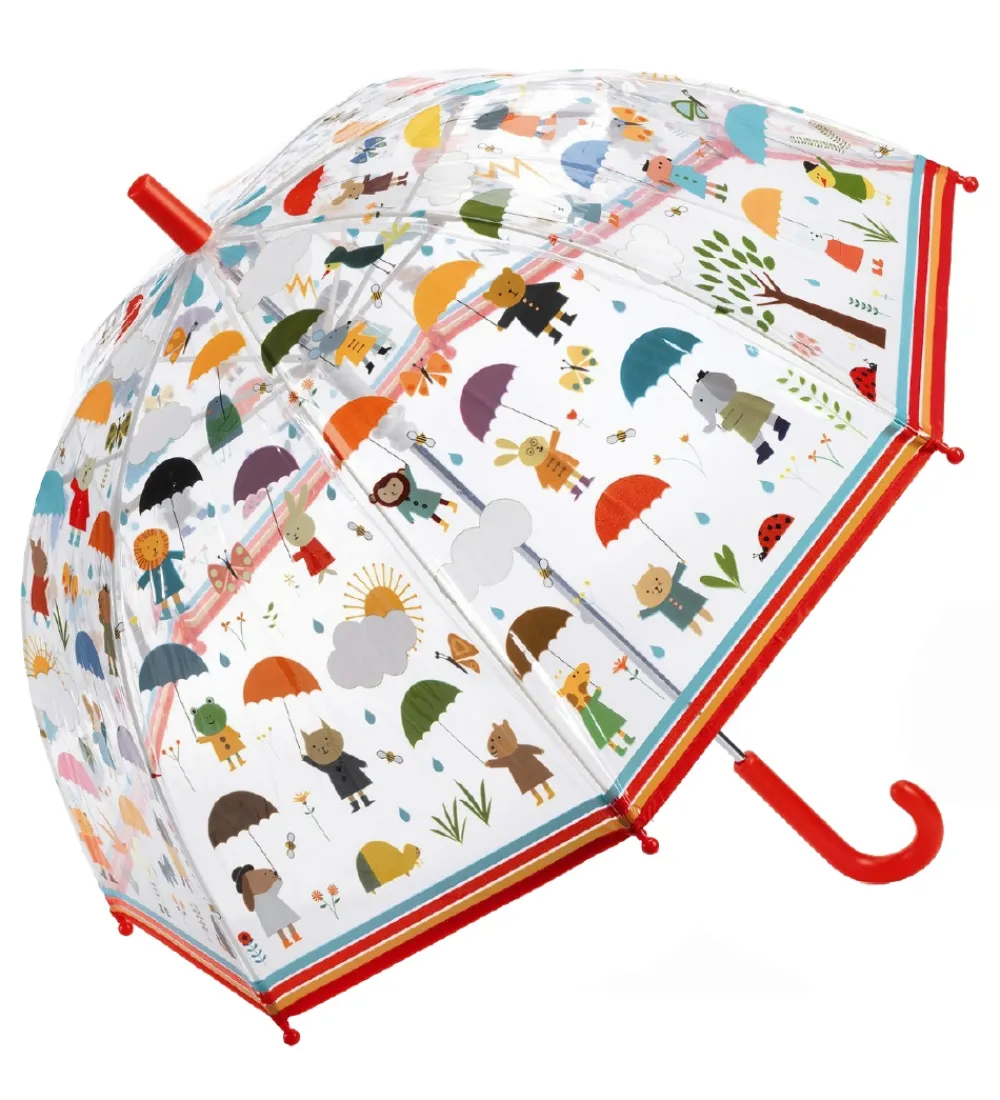 Flot Djeco paraply i gennemsigtigt, blødt plast med print af forskellige dyr, der holder en paraply og med et rødt håndtag.