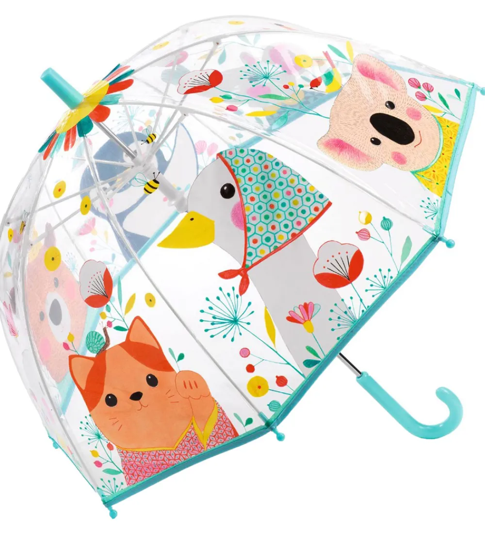 Fin Djeco paraply i gennemsigtigt, blødt plast med et print med forskellige dyr med farverigt tøj på, og hvor nogle af dem spiller på et instrument. Spidsen og håndtaget af paraplyen er turkisgrøn.