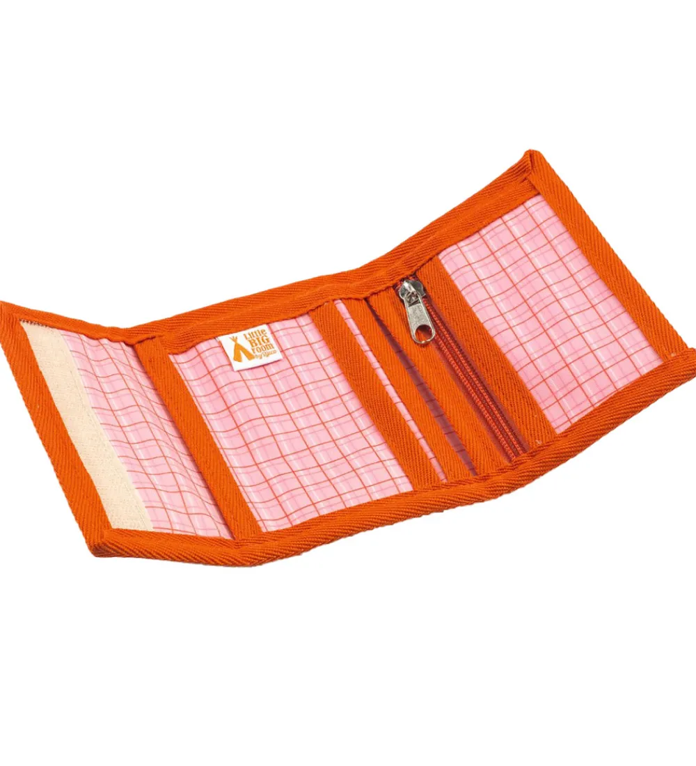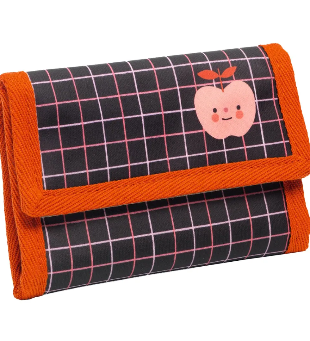 Flot Djeco pung i brun med et ternet mønster i rød og rosa og med rode kanter, og på den ene side er der trykt et rosa æble.