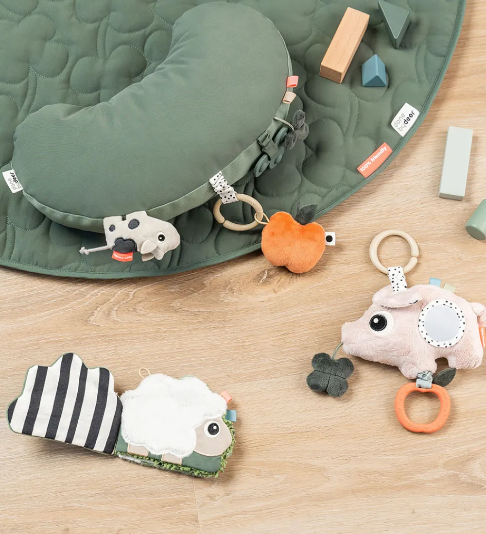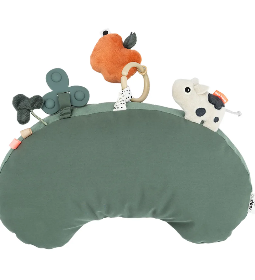 Done by Deer puden med aktivitetslegetøj er perfekt til, når barnet skal ligge på maven og træne at kigge op, da aktivitetslegetøjet er sjovt at undersøge. Der er tre forskellige stykker aktivitetslegetøj, som stimulerer sanserne ved lyd såsom klokke og knitrepapir, og som kan bides i og undersøges med hænderne.