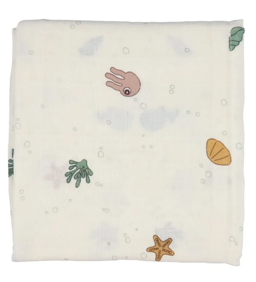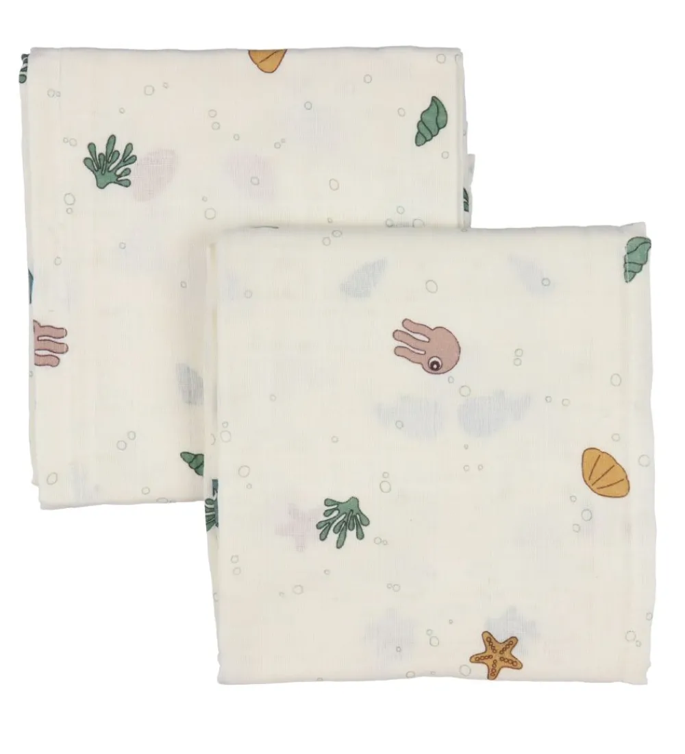Skønne Done by Deer babysvøb solgt i en to pak i beige, med forskellige havdyr og planter i grønne, blå, brune og lilla nuancer.