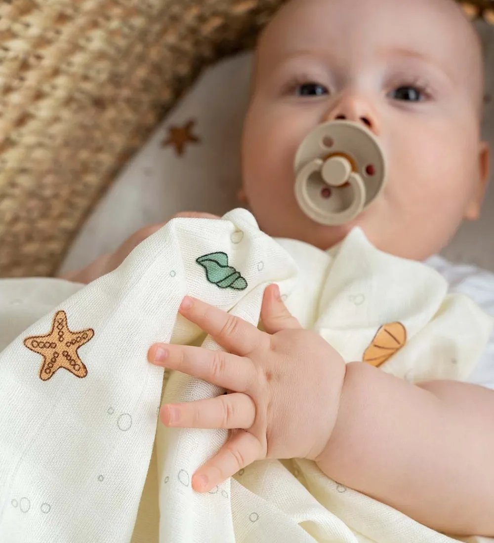 Done by Deer babysvøb er kvadratiske, og de er fremstillet i en blød bomuldskvalitet med muslin struktur.