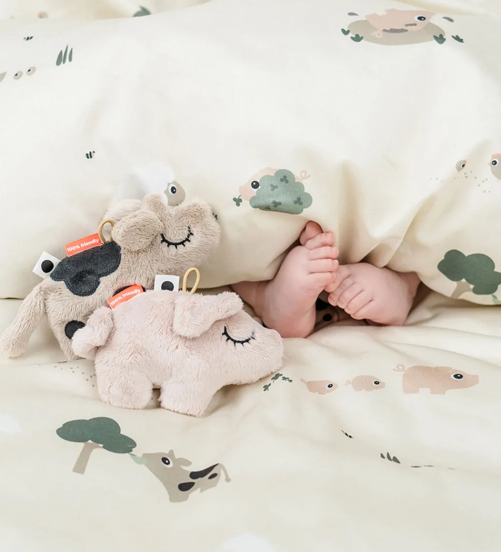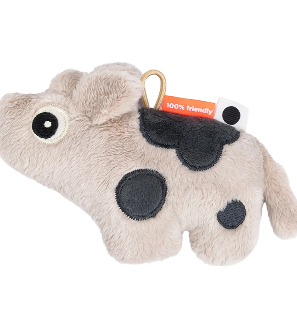 Sød Done By Deer rangle med form som en grå, plettet gris og med en vågen og sovende side.