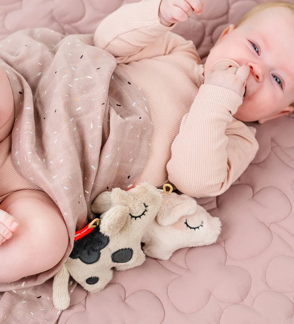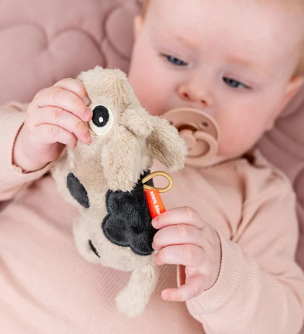 Done By Deer ranglen har en bjælde indeni, som klinger, når barnet leger med den. Ranglen er lavet i et blødt materiale, og ranglens side har knitrepapir på indersiden. Ranglen har en elastisk hank, så den kan hænges op på f.eks. et aktivitetsstativ eller i barnevognen.