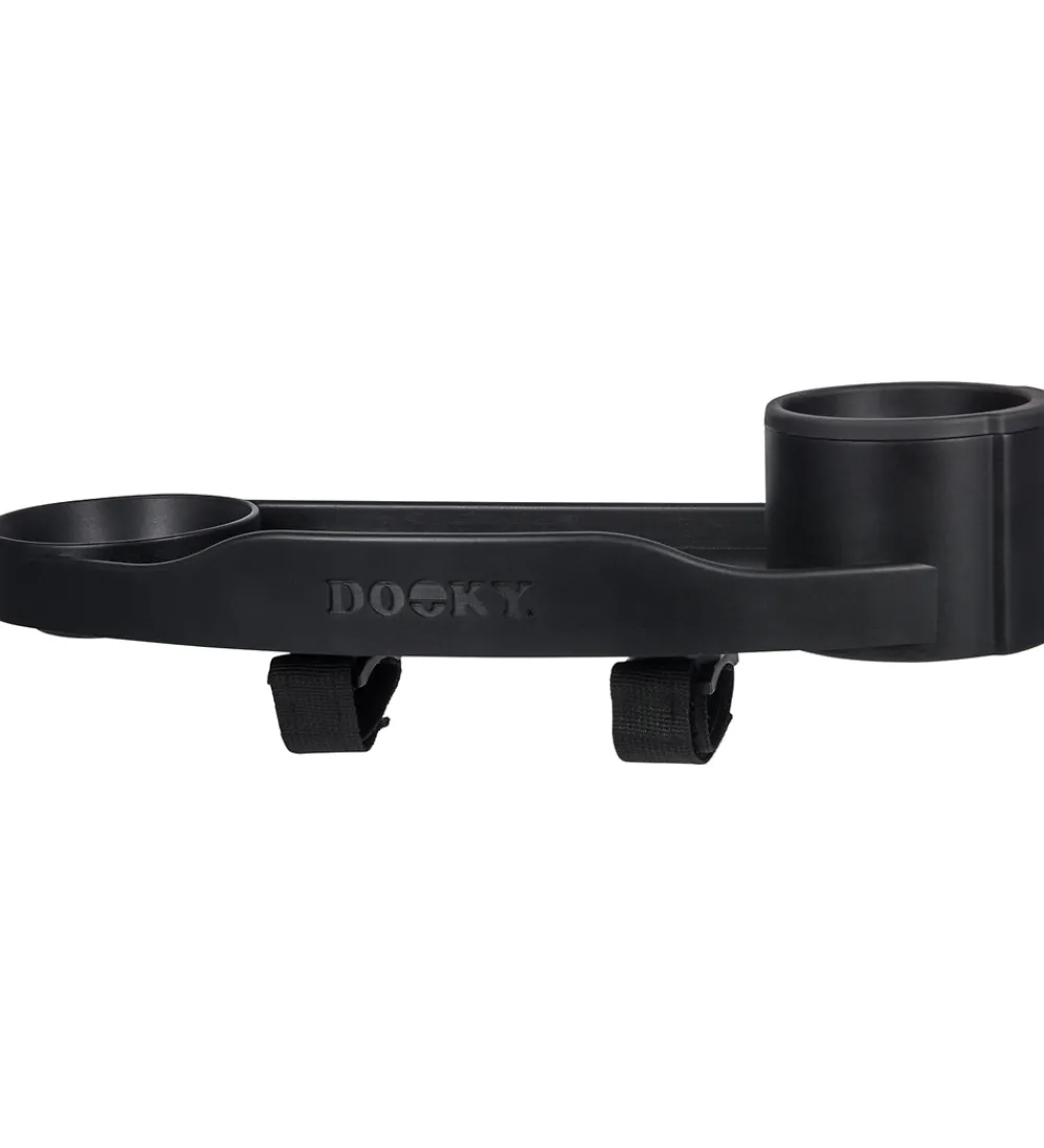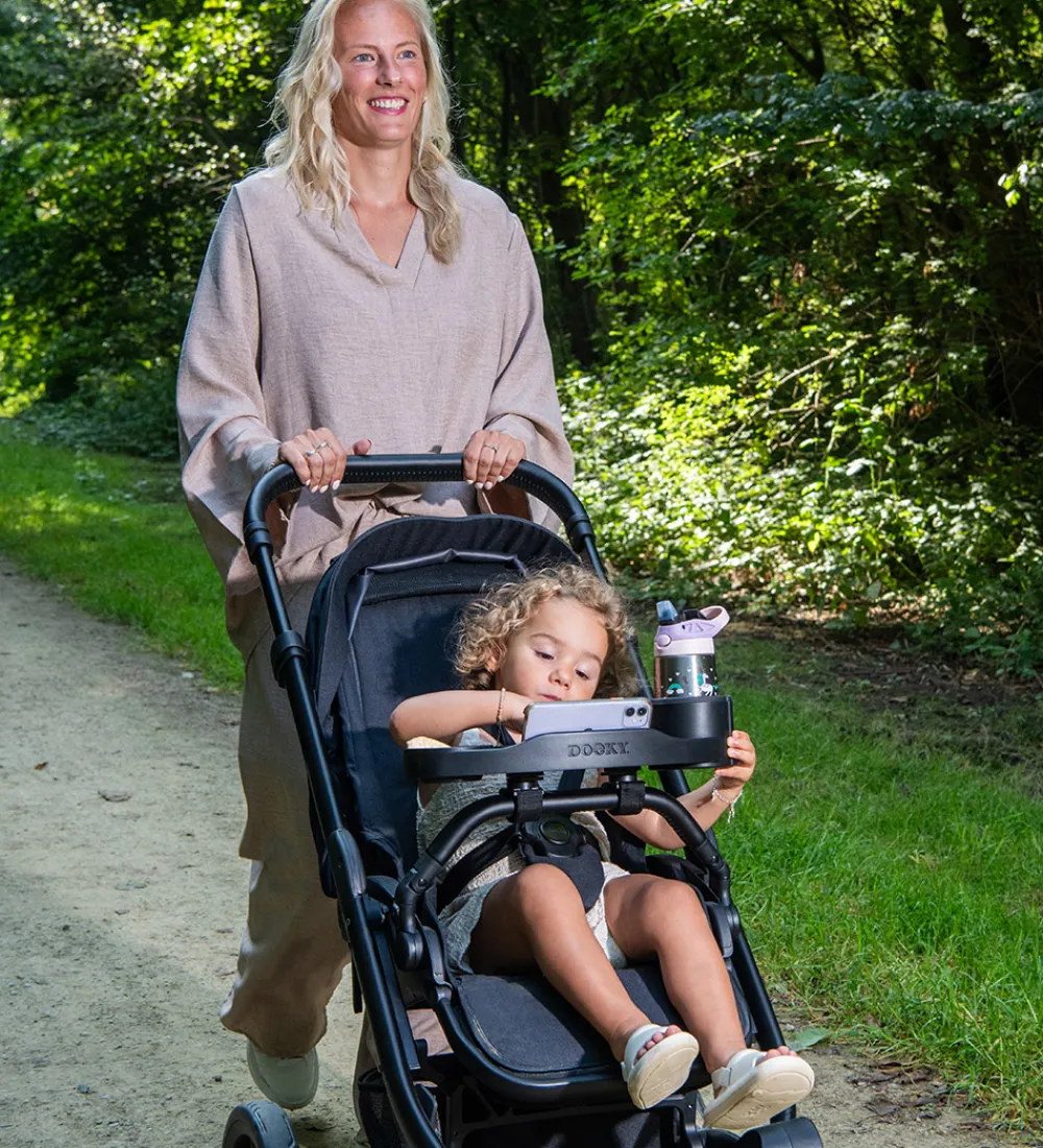 Dooky bakkebordet monteres fortil på klapvognen i stedet for frontbøjlen eller på styret på barnevognen med velcrobånd på undersiden af bakken. Bakken er lavet af plastik med høje kanter, så man kan lægge legetøj eller på bordet til barnet. I den ene side er der plads til en kop, og i den anden side er der en fordybning til snacks. Der er også en revne, hvor man kan placere en mobiltelefon, så den står stabilt – enten til at underholde barnet eller den voksne.