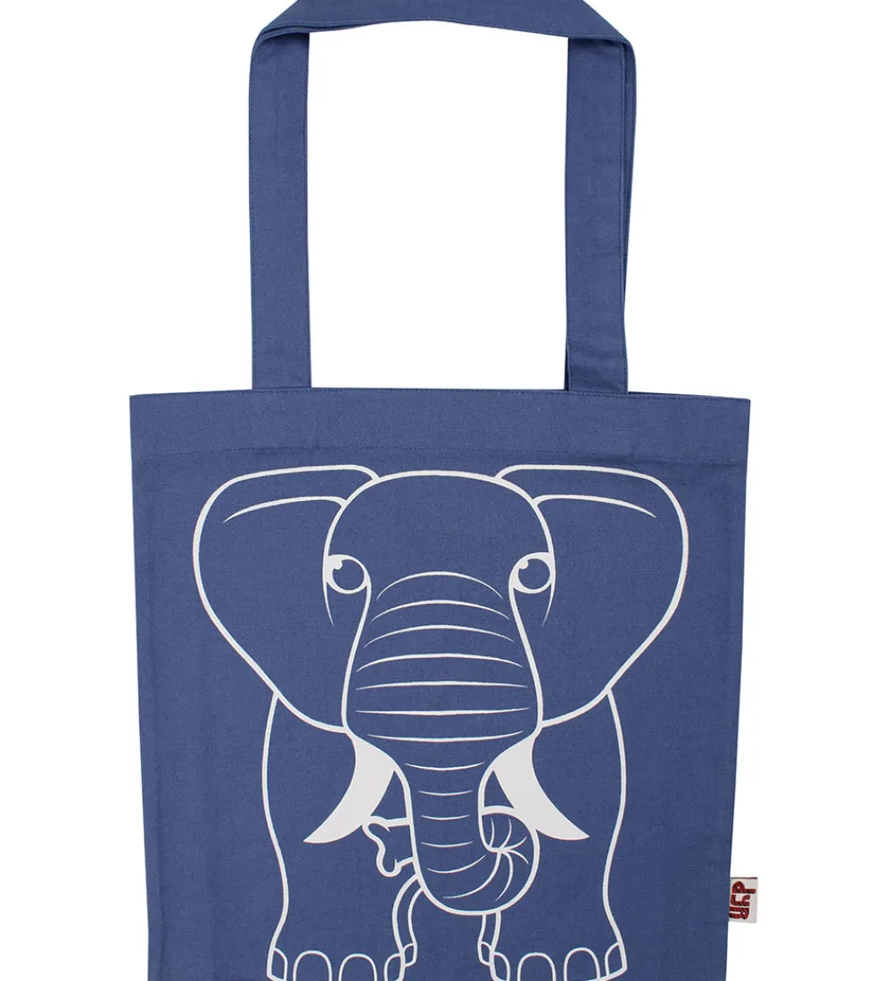 Fin DYR taske i blå med et stort print af en elefant i hvid på fronten. Den har lange stropper, så den både kan bæres i hånden og over skulderen. Tasken er fremstillet i bomuldskanvas.