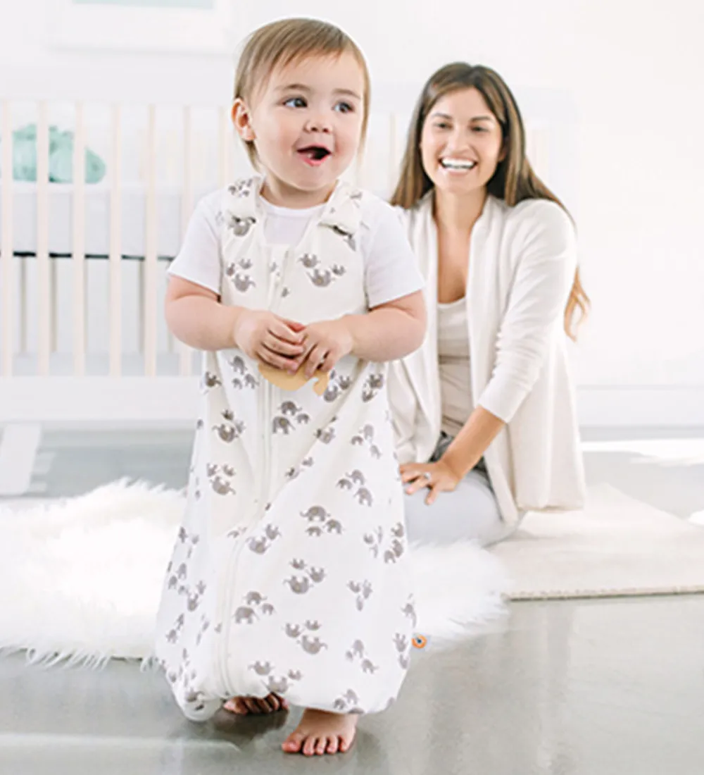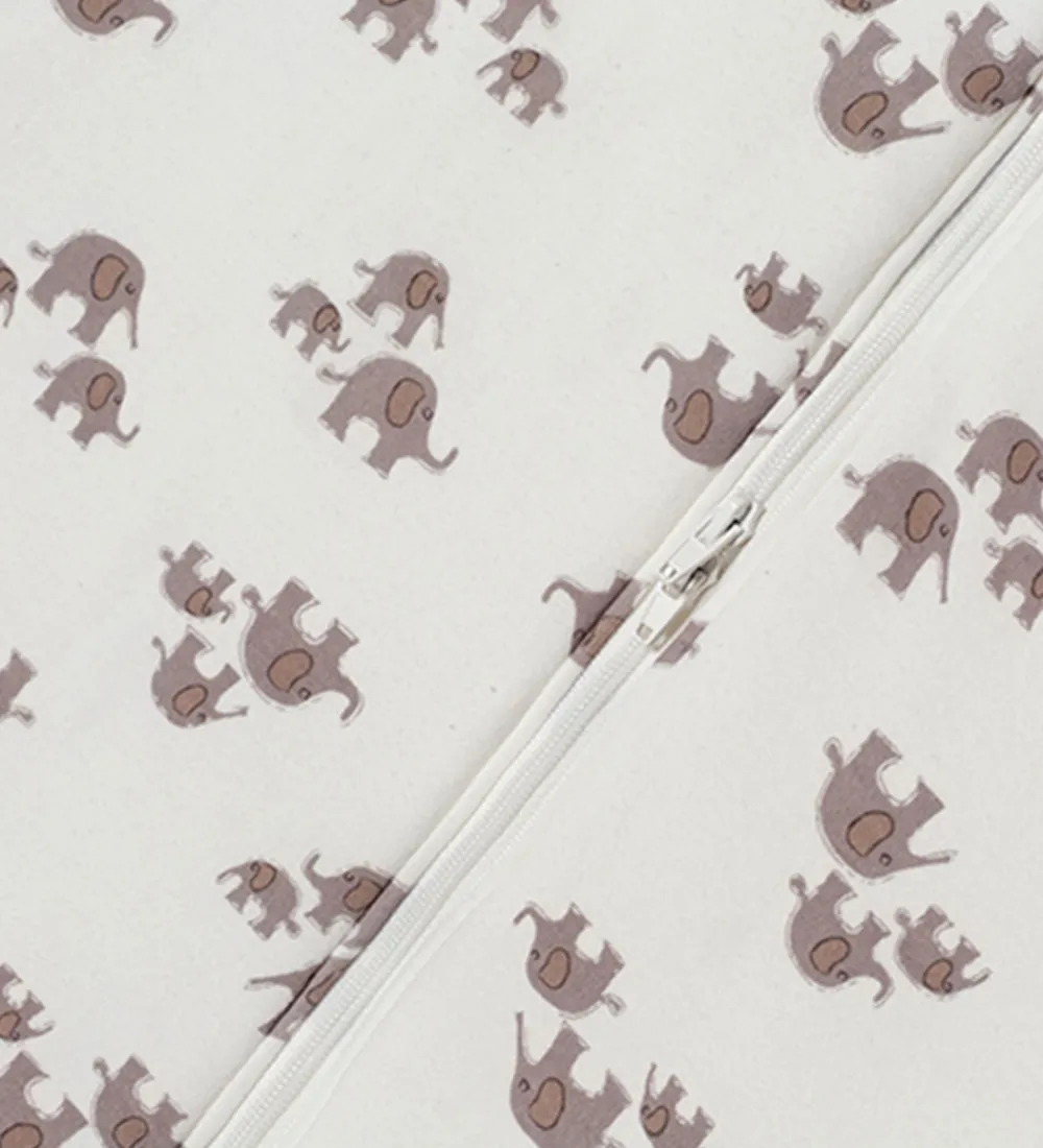 Praktisk Ergobaby sovepose i hvid med et beige print af fine elefanter.