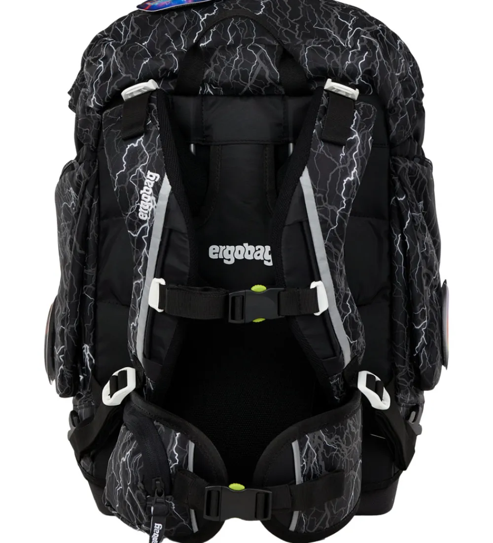Sej og praktisk Ergobag skoletaske i sort med lynprint og 4 velcromærker.