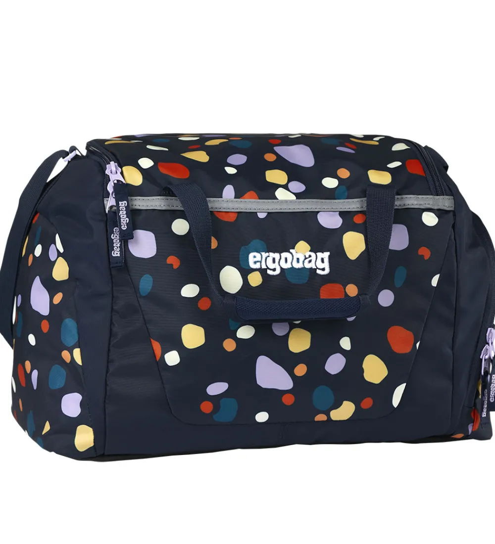 Flot Ergobag sportstaske i navyblå med et prikket alloverprint med mange farver og lilla detaljer.