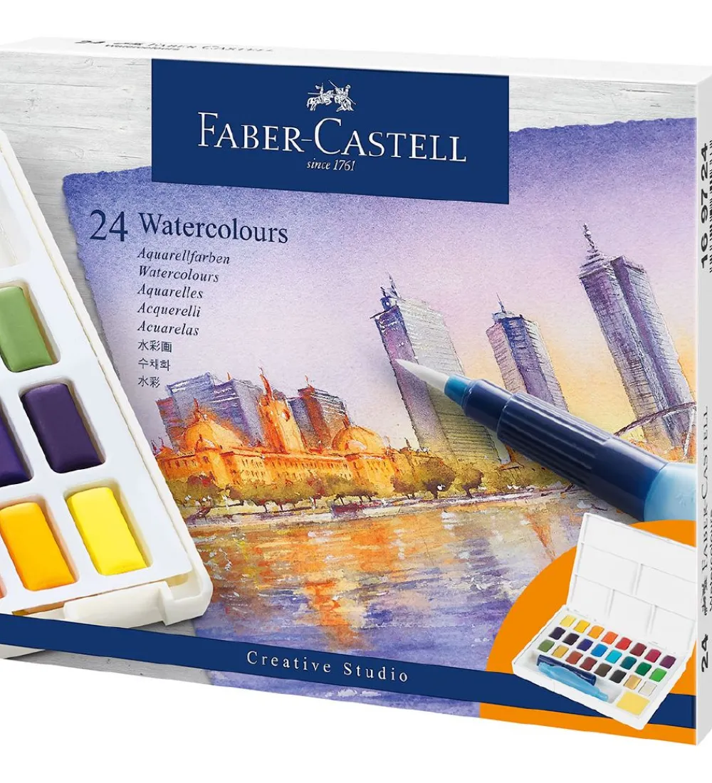 Skønt Faber-Castell vandfarver i 24 forskellige, flotte farver, med en medfølgende pensel.