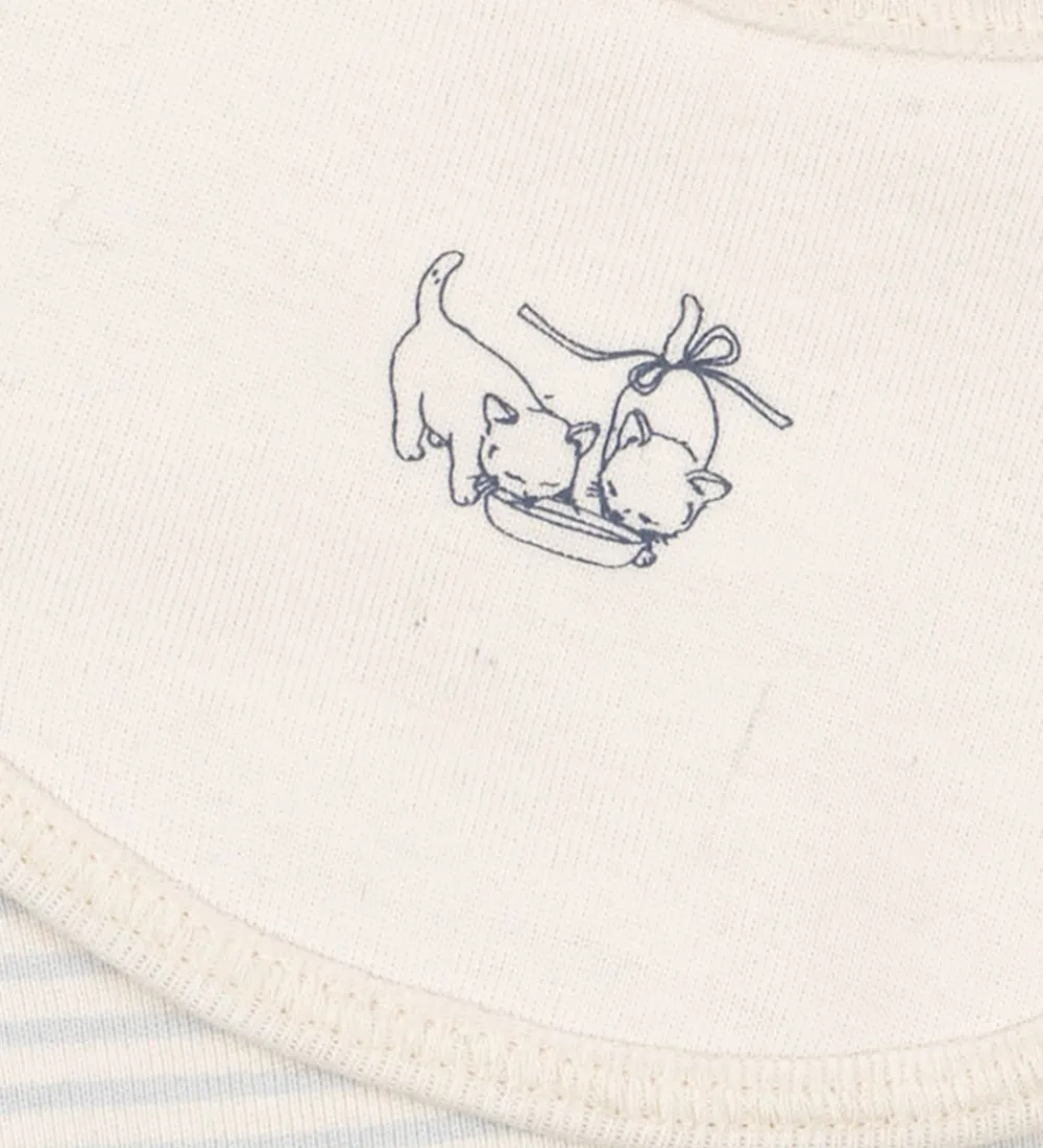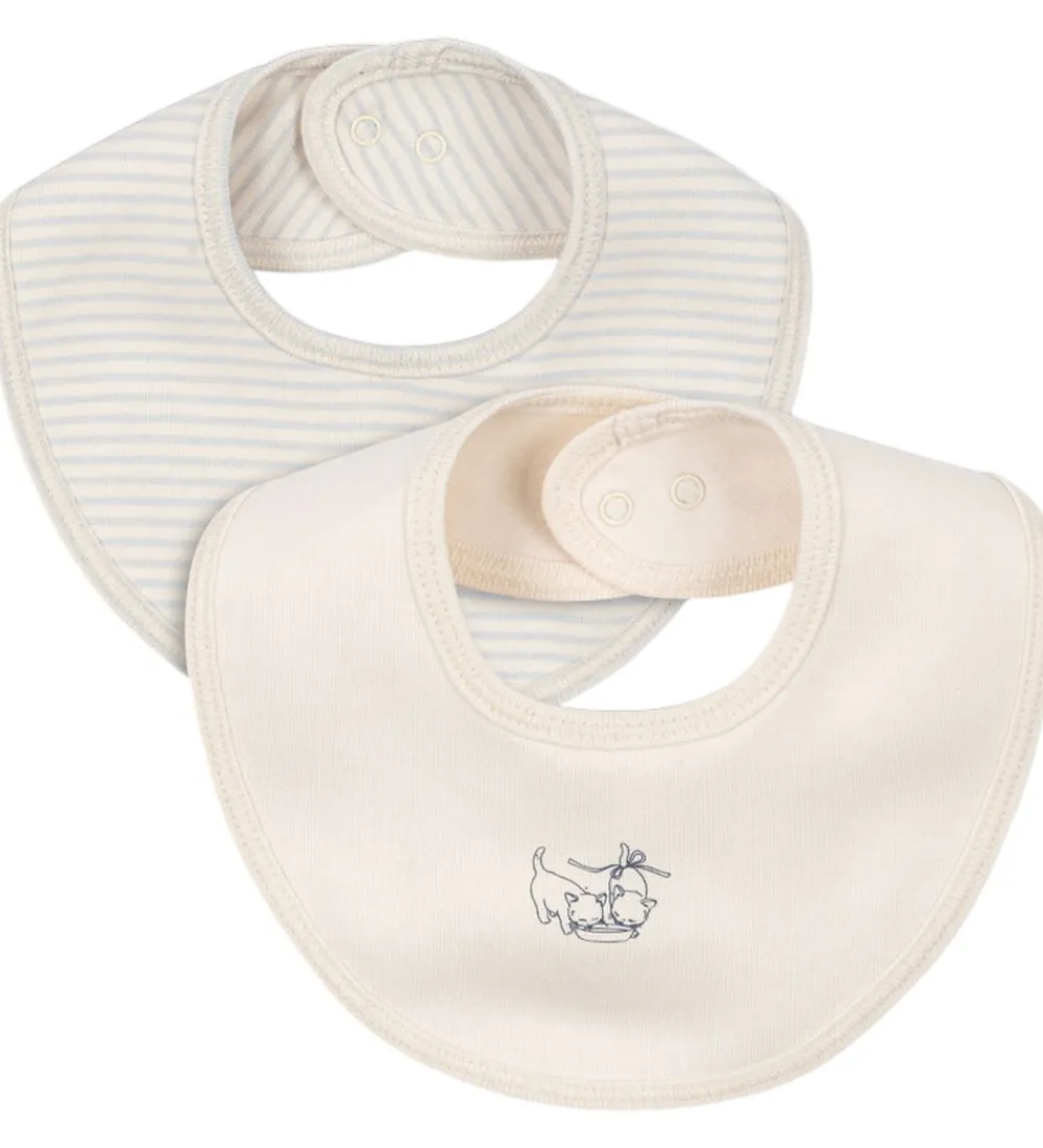 Funktionelle Fanga Fontana savlesmække i en pakke med to. Den ene har et diskret, stribet mønster i lyseblå og hvid, mens den anden er ensfarvet cremehvid med et tryk af to katte.