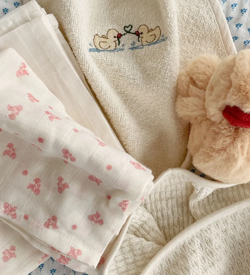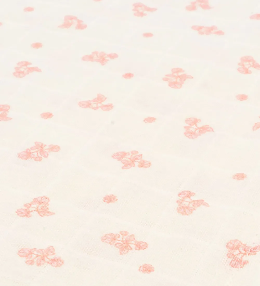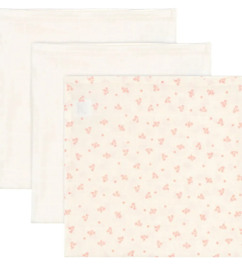 Praktiske Fanga Fontana stofbleer i en 3-pak. To af stofbleerne er ensfarvet cremehvid mens én er i cremehvid med et mønster med små, lyserøde blomster. Fanga Fontana stofbleerne har en kvadratisk form og en blød musselin-struktur.