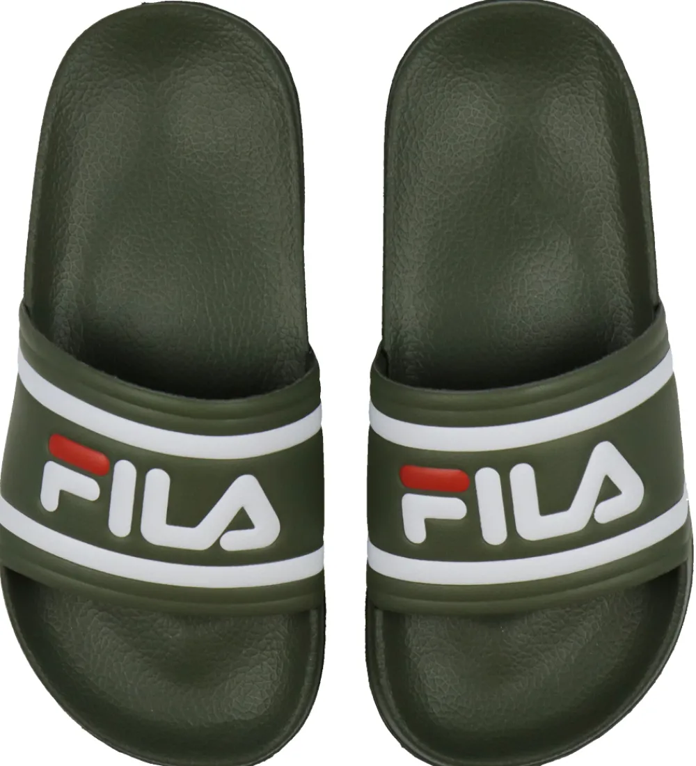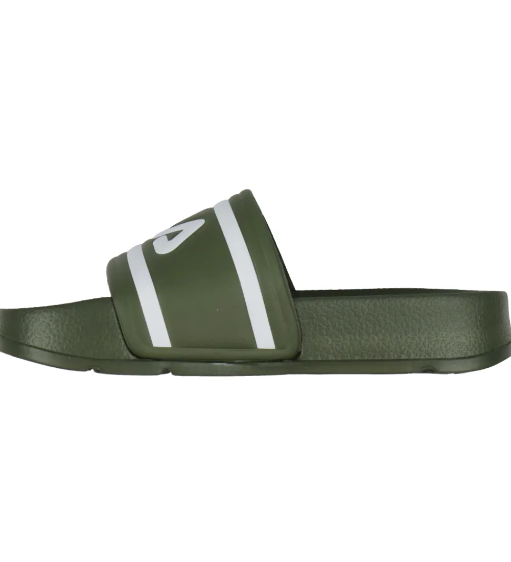 Flotte Fila badesandaler i armygrøn med to hvide striber og et stort logo i hvid og rød.