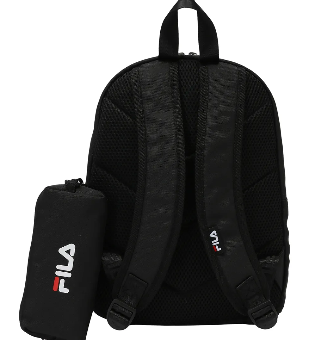Fila rygsækken åbnes i toppen med en lynlås med to skydere, og den består af ét stort rum. Ind mod ryggen er der en vatteret lomme til f.eks. en tablet. På fronten sidder der en stor lynlåslomme, og i den ene side er der en meshlomme med elastikkant. Rygsækken er vatteret i ryggen og i bunden, den har ånbart mesh på ryggen. Rygsækken har brede, vatterede skulderremme med mesh på bagsiden, og de kan justeres i længden. Der medfølger et aflangt penalhus, som består af ét stort rum, og det lukke med en lynlås.