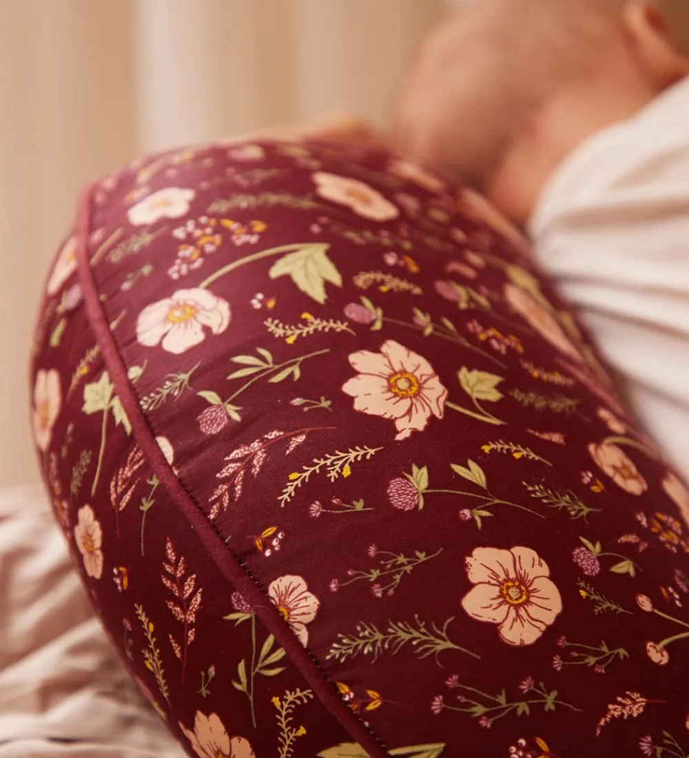 God Filibabba ammepude i mørkerød med et lilla skær og print af blomster i fine nuancer over det hele.