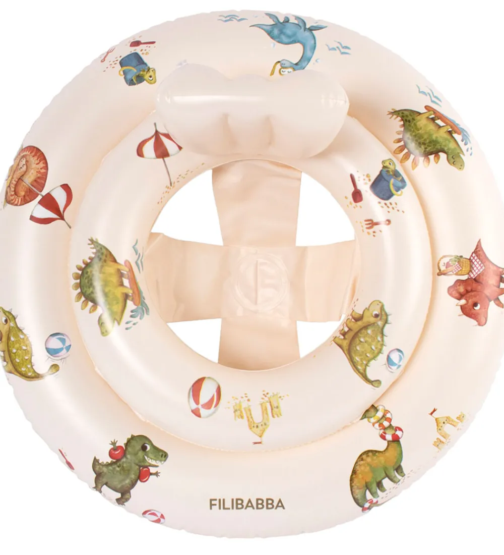 Baderingen er designet med et sæde og har et indbygget ryglæn for ekstra støtte. Baderingen pustes op med en praktisk ventil, der kan trykkes ind i baderingen, så den ikke kommer til at genere legen i vandet.