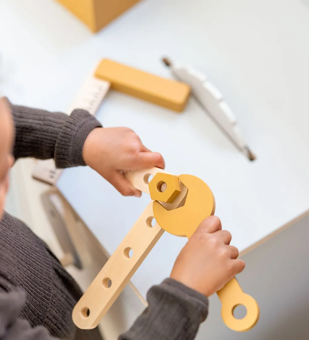 Flexa værktøjssæt der bl.a. inkluderer en skruenøgle, en hamre og et måleværktøj. Alt er designet til leg og læring, perfekt til små hænder. Værktøjssættet hjælper børn med at udvikle deres fantasi og finmotorik. Flexa’s stilrene design og farver gør det til et attraktivt valg.
