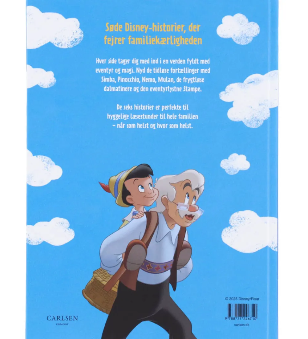 Bogen indeholder farverige og detaljerede illustrationer samt seks søde Disney-historier, der fejrer familiekærligheden. Forlaget Carlsens bog inviterer børn ind i Disneys magiske univers.
