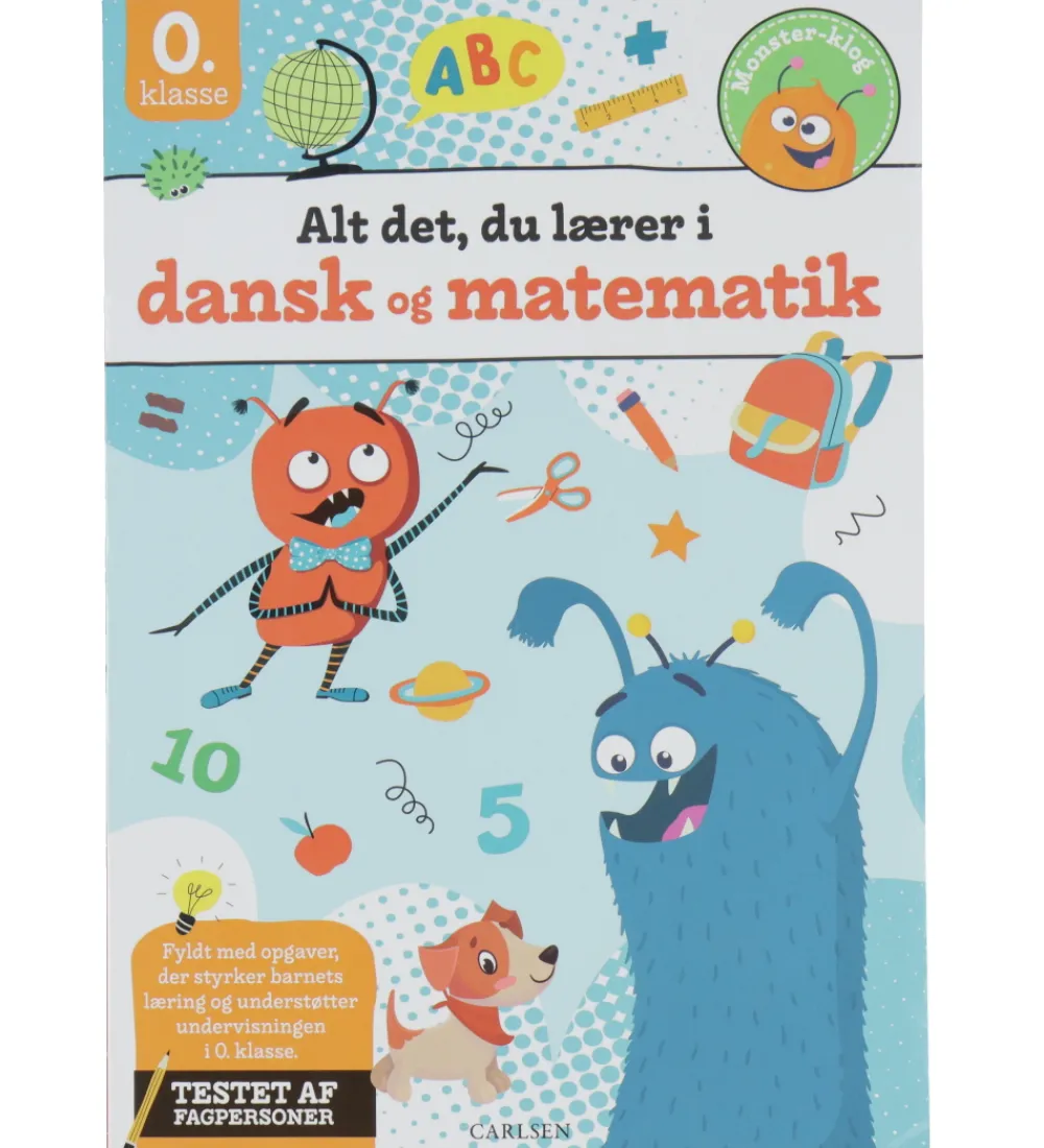 Sjov Forlaget Carlsen opgavebog med titlen “Alt det, du lærer i dansk og matematik”. Opgavebogen er en del af Monster-klog-serien.
