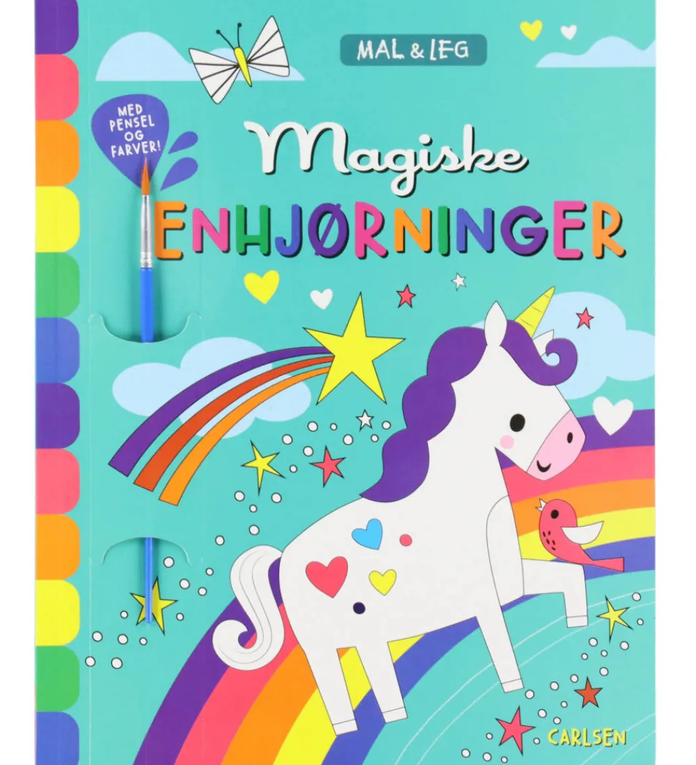 Malebogen indeholder enhjørningemotiver, regnbuer og stjerner, som inviterer til kreativitet. Den indeholder en pensel og seks forskellige vandfarver, som er placeret på hver side i malebogen. Perfekt til små kunstnere.