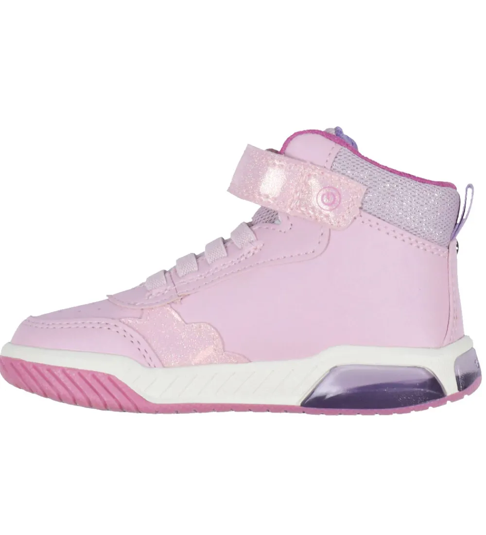 Flotte Geox blinkestøvler af mesh og imiteret skind i pink med glimmerdetaljer samt en sej enhjørninge-apllikation på siden. Blinkestøvlerne har LED-lys i hælen og stjernen, som blinker, når barnet går eller løber. LED-lysene kan tændes på indersiden og er ikke genopladelige.