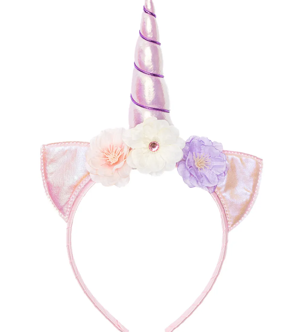 Flot Great Pretenders hårbøjle i rosa med fine, skinnende ører og et enhjørningehorn i lilla på toppen samt fine blomster i rosa, lilla og hvid.