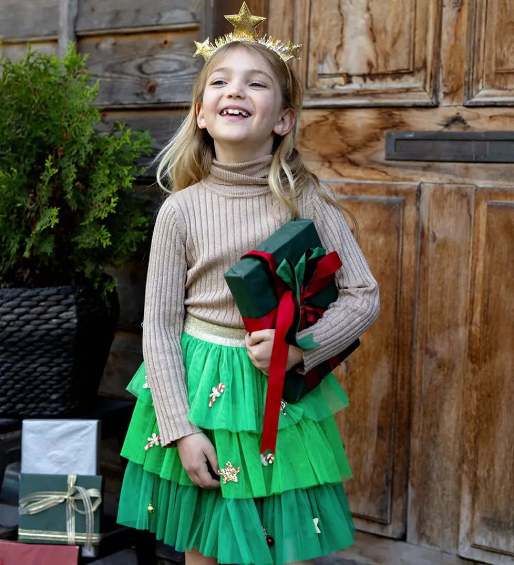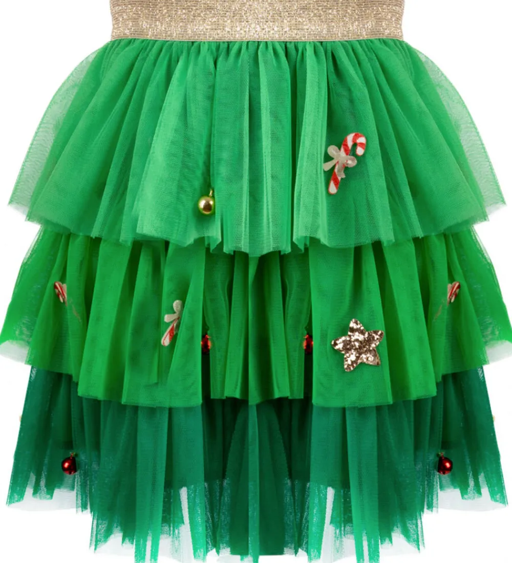 Flot Great Pretenders udklædning i form af en grøn tylnederdel med guldstjerner, juleklokker og slikstokke.