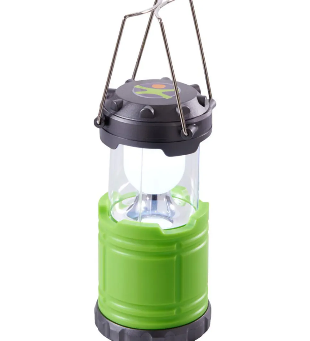 Praktisk HABA campinglanterne i grøn og grå med to håndtag i metal. Den har indbygget LED-lys, som giver god belysning på campingturen. Lampen tændes ved at trække op i låget, hvor lampen kommer frem. Når man ikke skal bruge lyset, skubber man låget ned igen, så lampen ikke fylder så meget. Den kan nemt hænges op og transporteres.