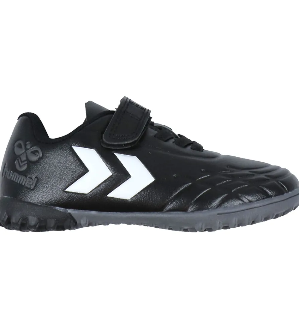 Smarte Hummel fodboldstøvler i sort imiteret læder med hvide og mørkegrå logoer.