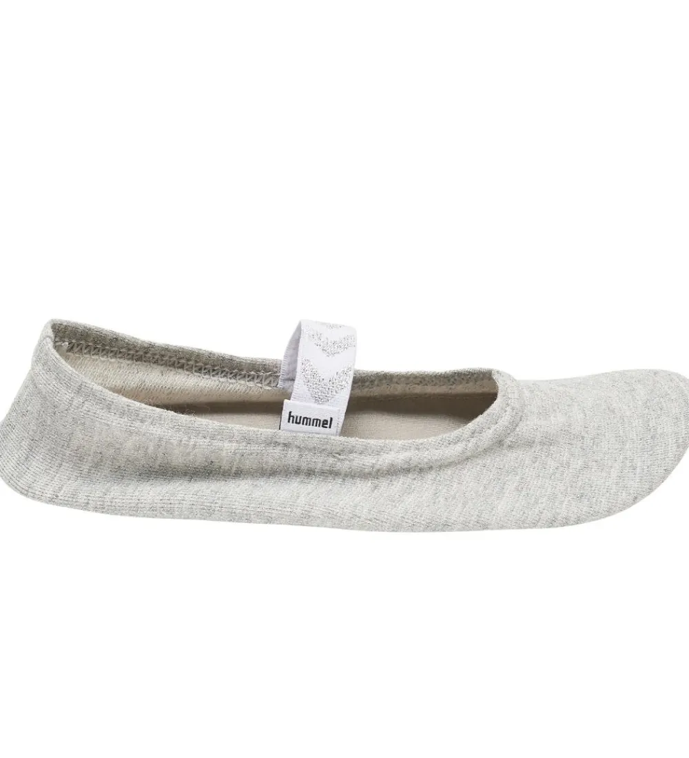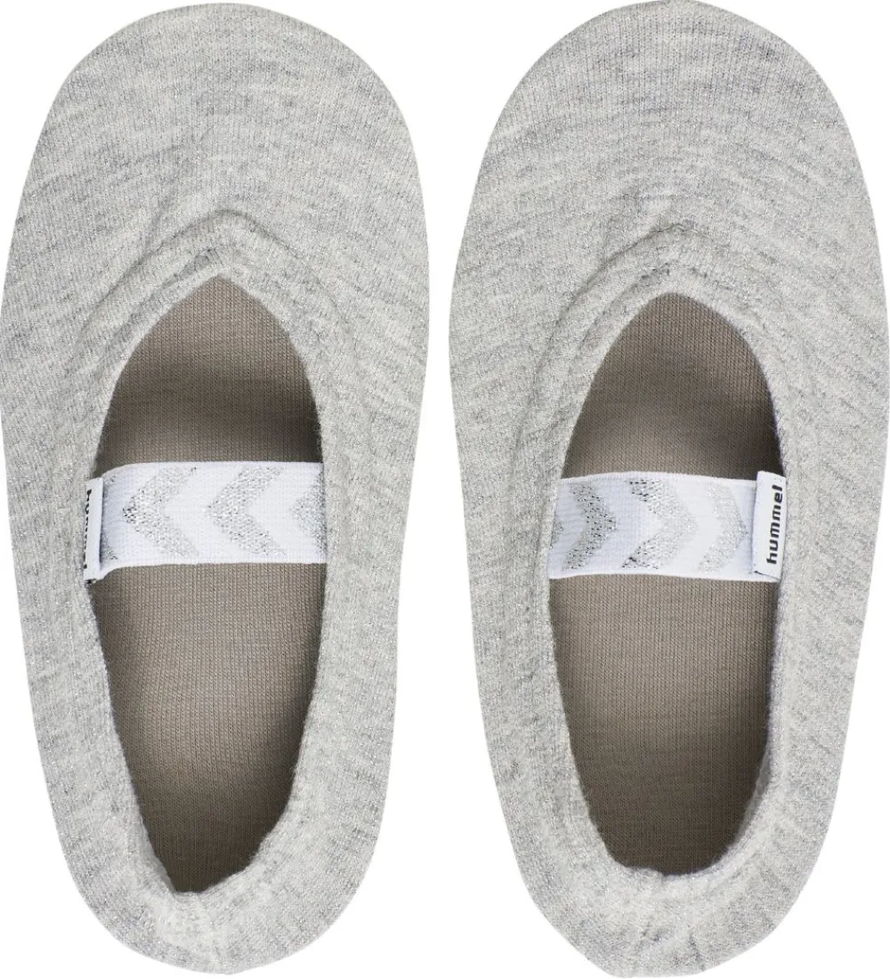 Fine Hummel gymnastiksko i meleret grå med glimmer. Skoen har et elastikbånd henover vristen med de karakteristiske Hummel-vinkler i hvid og grå glimmer.
