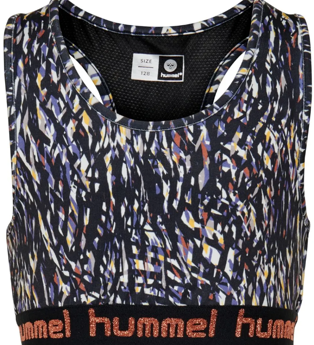 Hummel toppen har brede skuldre stropper og har et elastikbånd i bunden med “Hummel” skrevet i brun glimmer. Toppen er i to lag for at sikre en fast og behagelig pasform. Toppen er i et lækker materiale og er perfekt til sport.