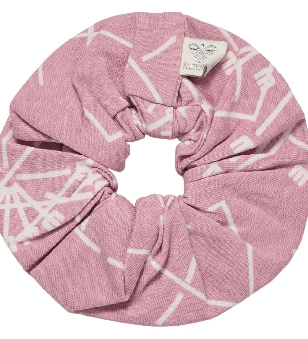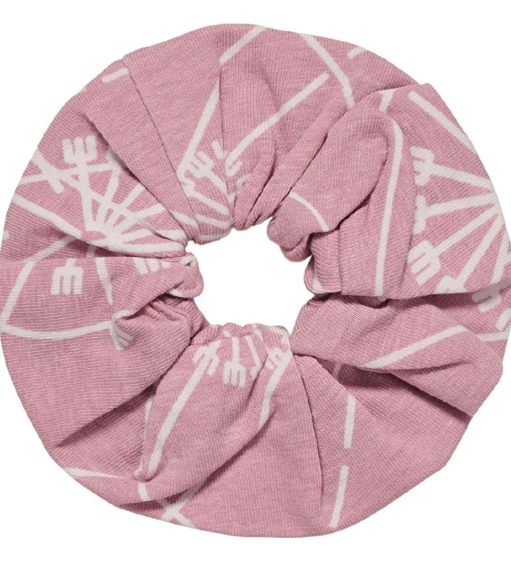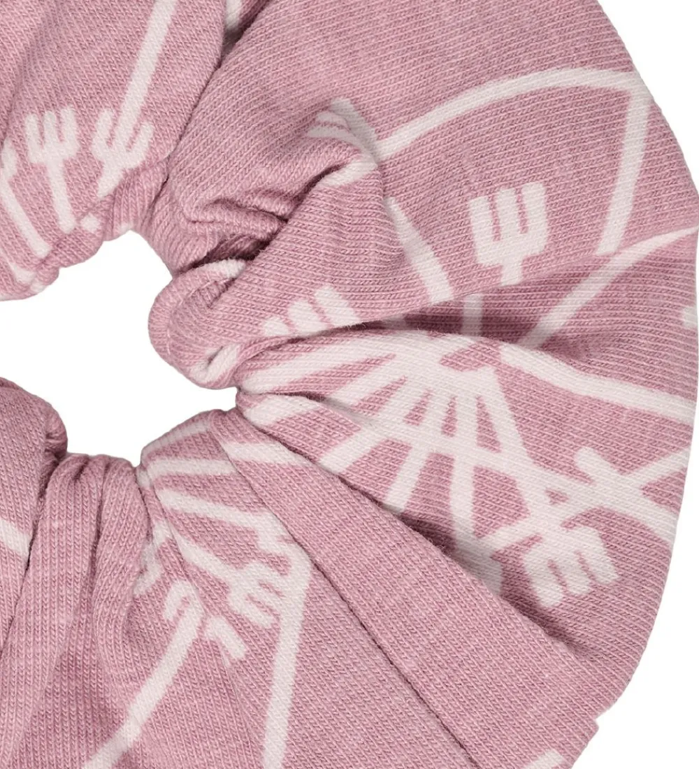 Sød Hummel scrunchie i rosa, med print af mælkebøtter i hvid over det hele.