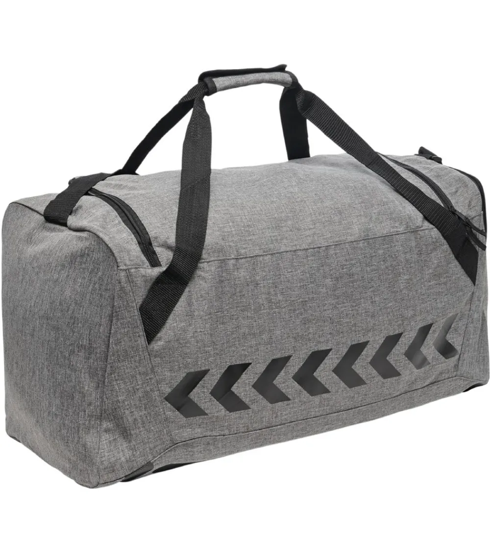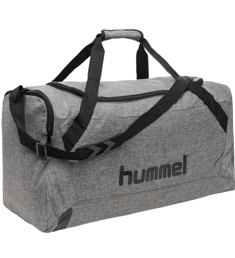 Praktisk Hummel sportstaske i meleret grå med navnet “hummel” skrevet på den ene side samt under bunden i sort. På den anden side er de velkendte vinkler.