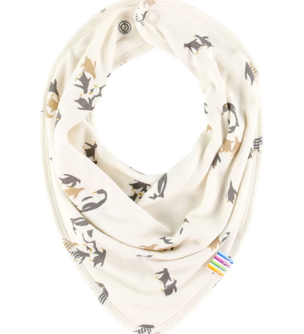 Sød Joha savlesmæk i en blød cremefarve med et mønster af små, brune og grå pingviner. Savlesmækken har trykknapper i nakken med to forskellige størrelsesmuligheder, der sikrer en fleksibel pasform. Savlesmækken er fremstillet af blødt bambus viskose og merinould.