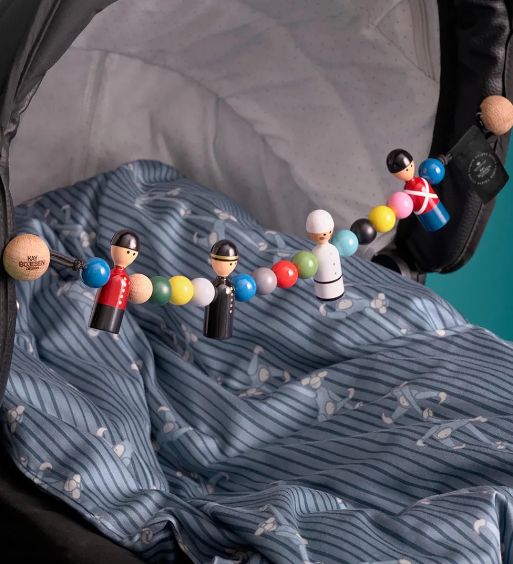Flot Kay Bojesen barnevognskæde af træ med farverige trækugler og 4 forskellige figurer.