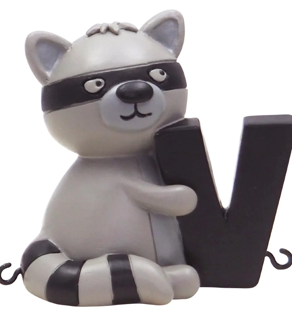 Fræk Kids by Friis vaskebjørn i grå med en stribet hale. Vaskebjørnen sidder og holder om blokbogstavet V, som er malet i sort.