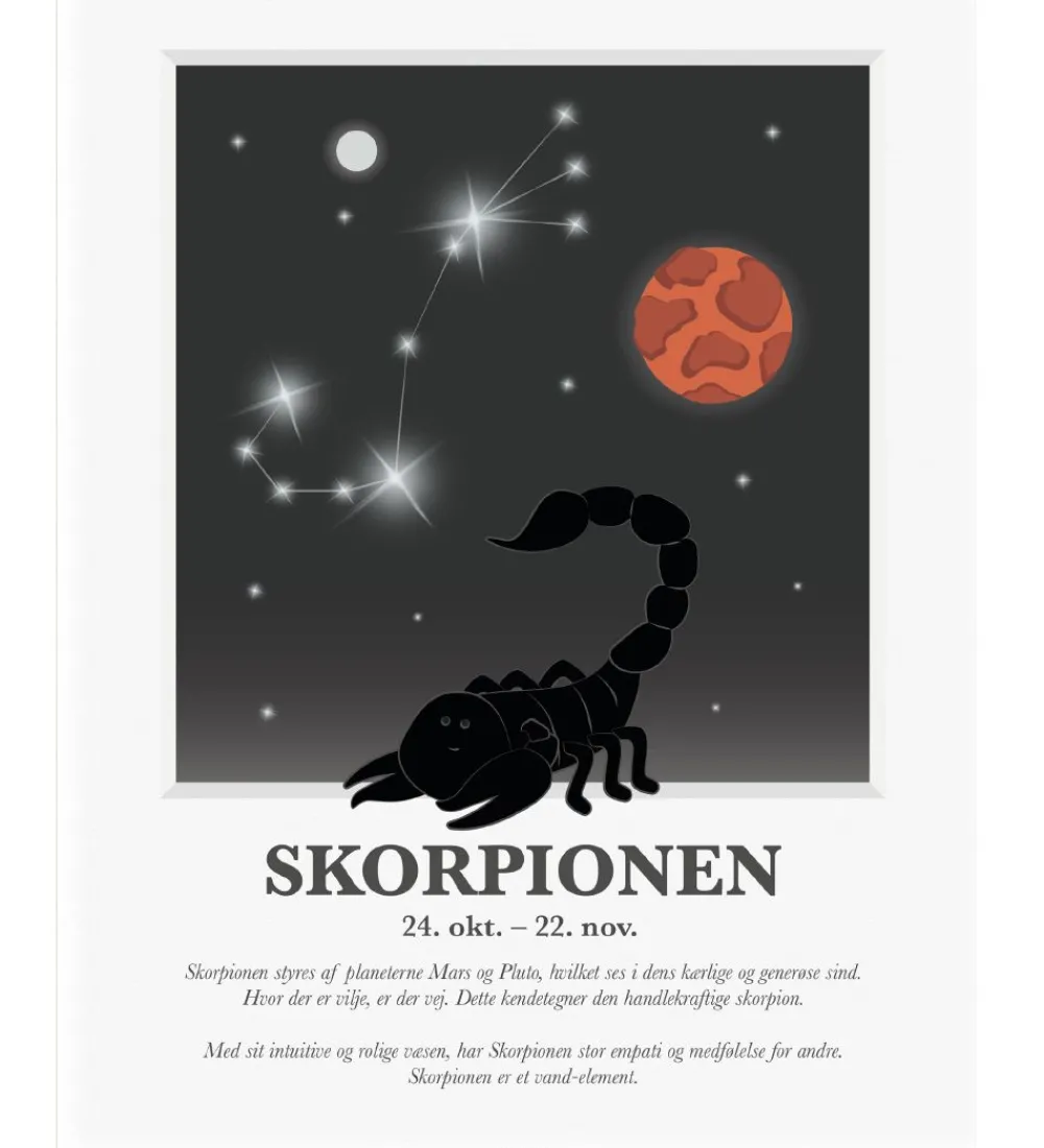 Fin Kids by Friis plakat i hvid, med nattehimlen i midten hvor stjernetegnet og en planet er fremhævet. I bunden er et matchende dyr til stjernetegnet samt de gældende datoer og et kort afsnit om stjernetegnet.