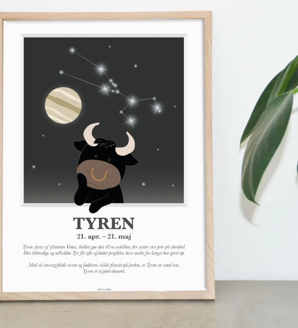 Fin Kids by Friis plakat i hvid, med nattehimlen i midten hvor stjernetegnet og en planet er fremhævet. I bunden er et matchende dyr til stjernetegnet samt de gældende datoer og et kort afsnit om stjernetegnet.