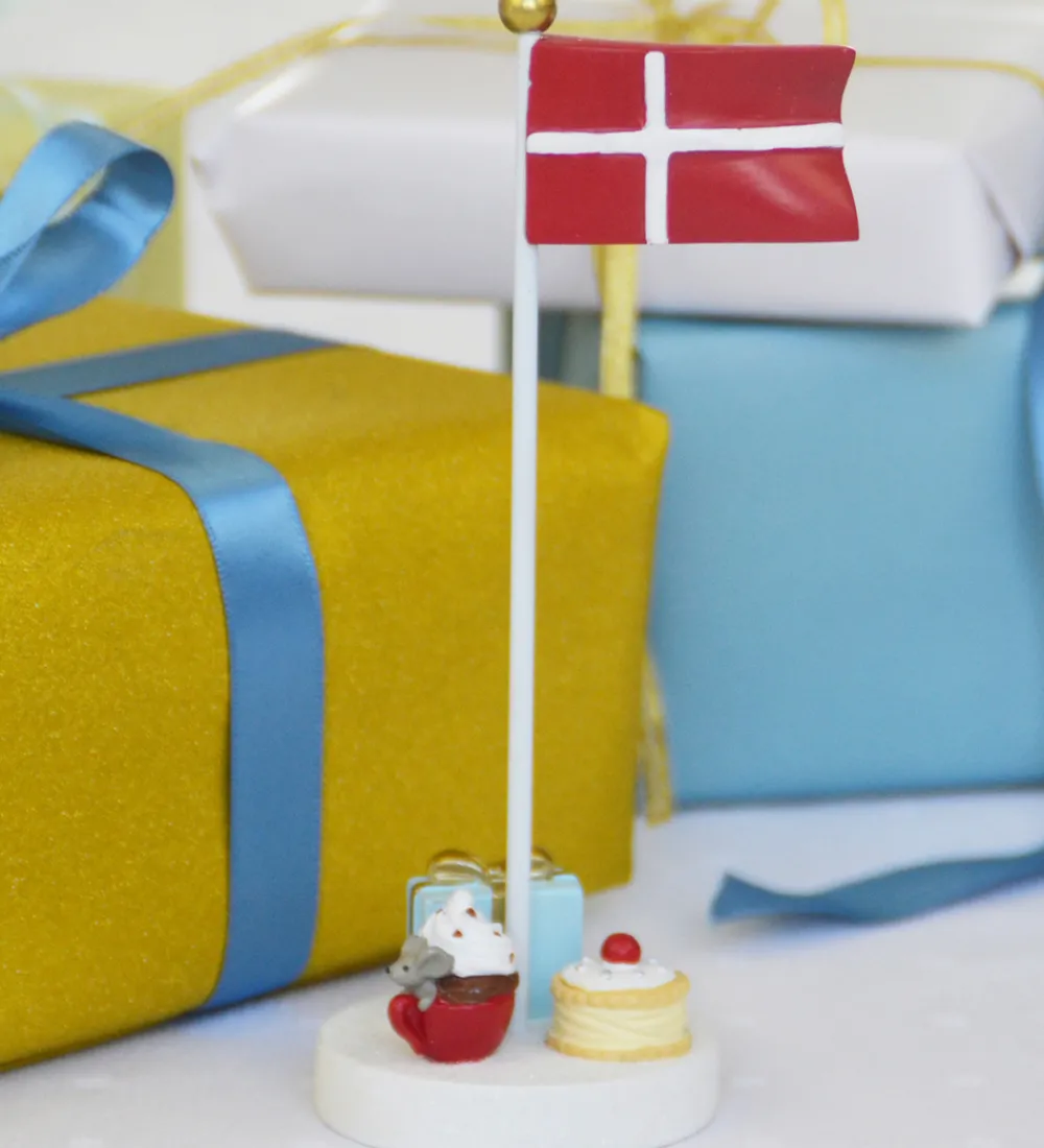 Sødt Kids by Friis bordflag med det danske flag i toppen, og en fod med gaver og kager, samt en lille mus.