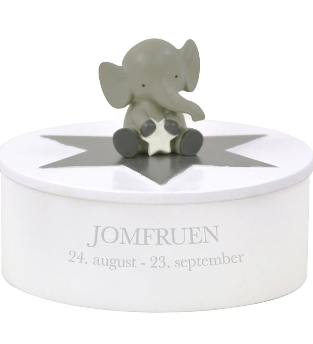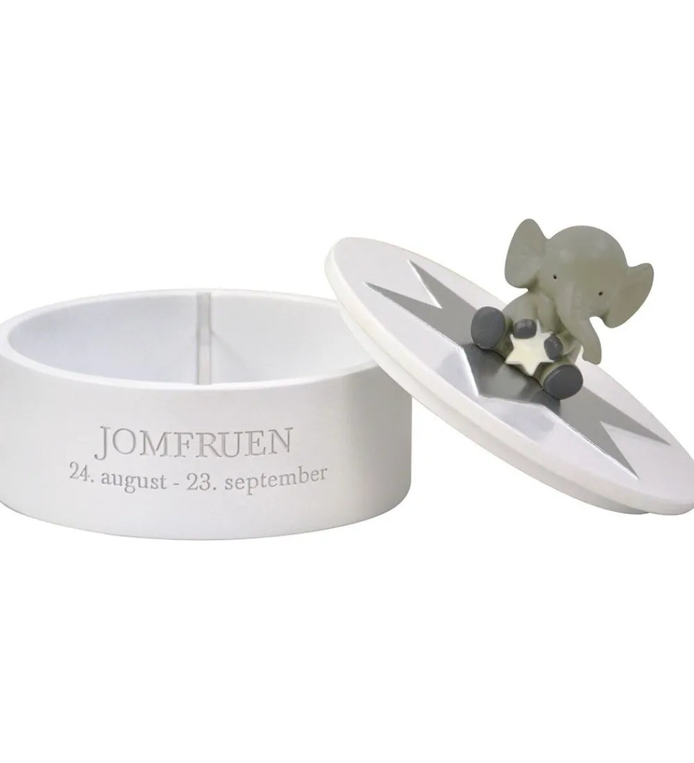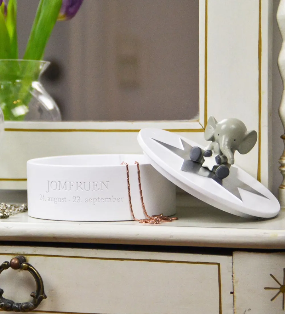 Flot Kids by Friis smykkeskrin i hvid med stjernetegnet Jomfruen. Ovenpå sidder en en sød figur, som skal illustrere stjernetegnet, og figuren holder en stjerne, der lyser i mørke. Fortil står der skrevet “JOMFRUEN” og stjernetegnets periode.