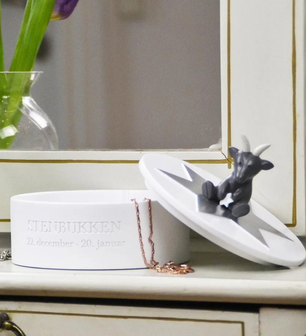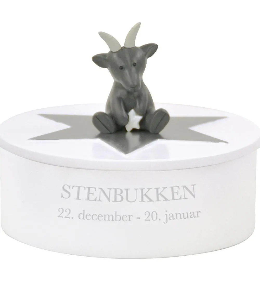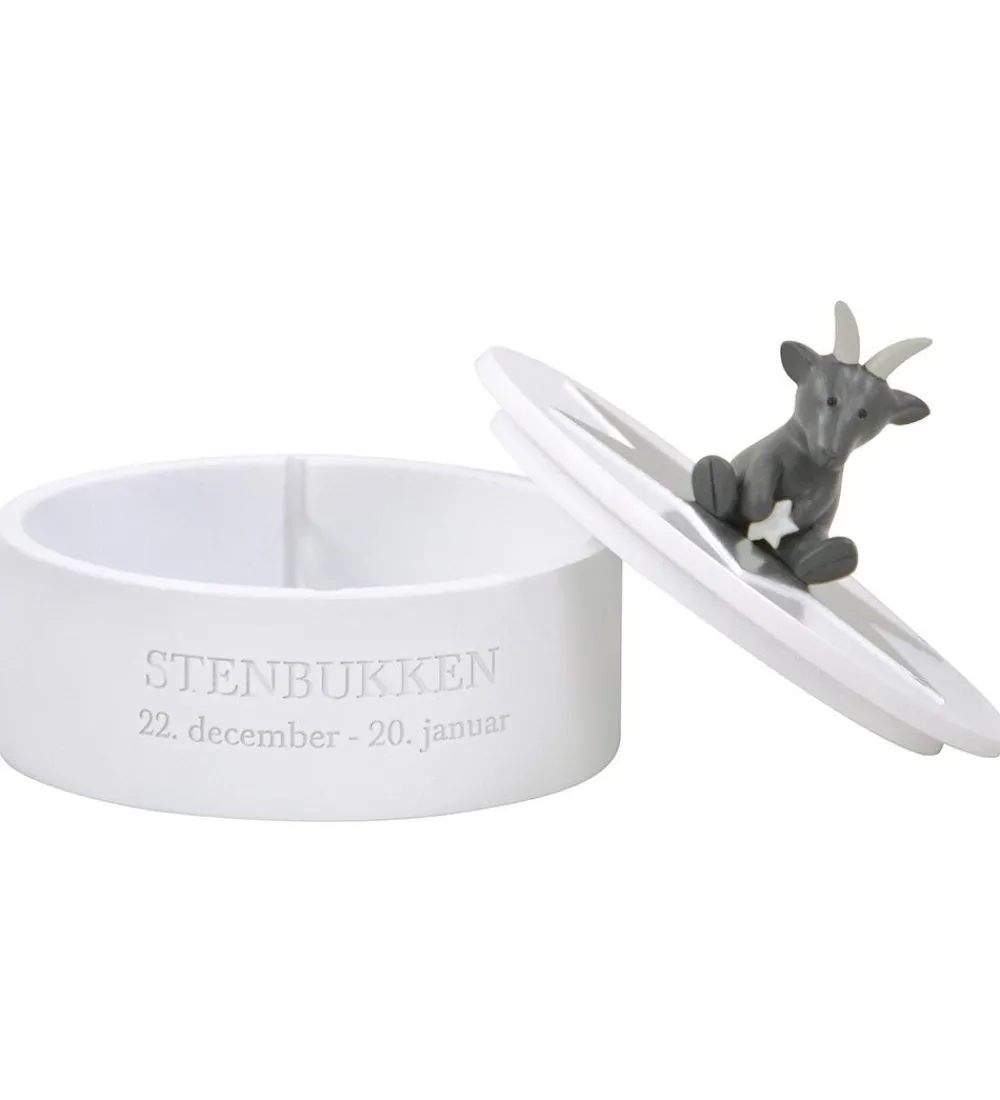 Flot Kids by Friis smykkeskrin i hvid med stjernetegnet Stenbukken. Ovenpå sidder en en sød figur, som skal illustrere stjernetegnet, og figuren holder en stjerne, der lyser i mørke. Fortil står der skrevet “STENBUKKEN” og stjernetegnets periode.