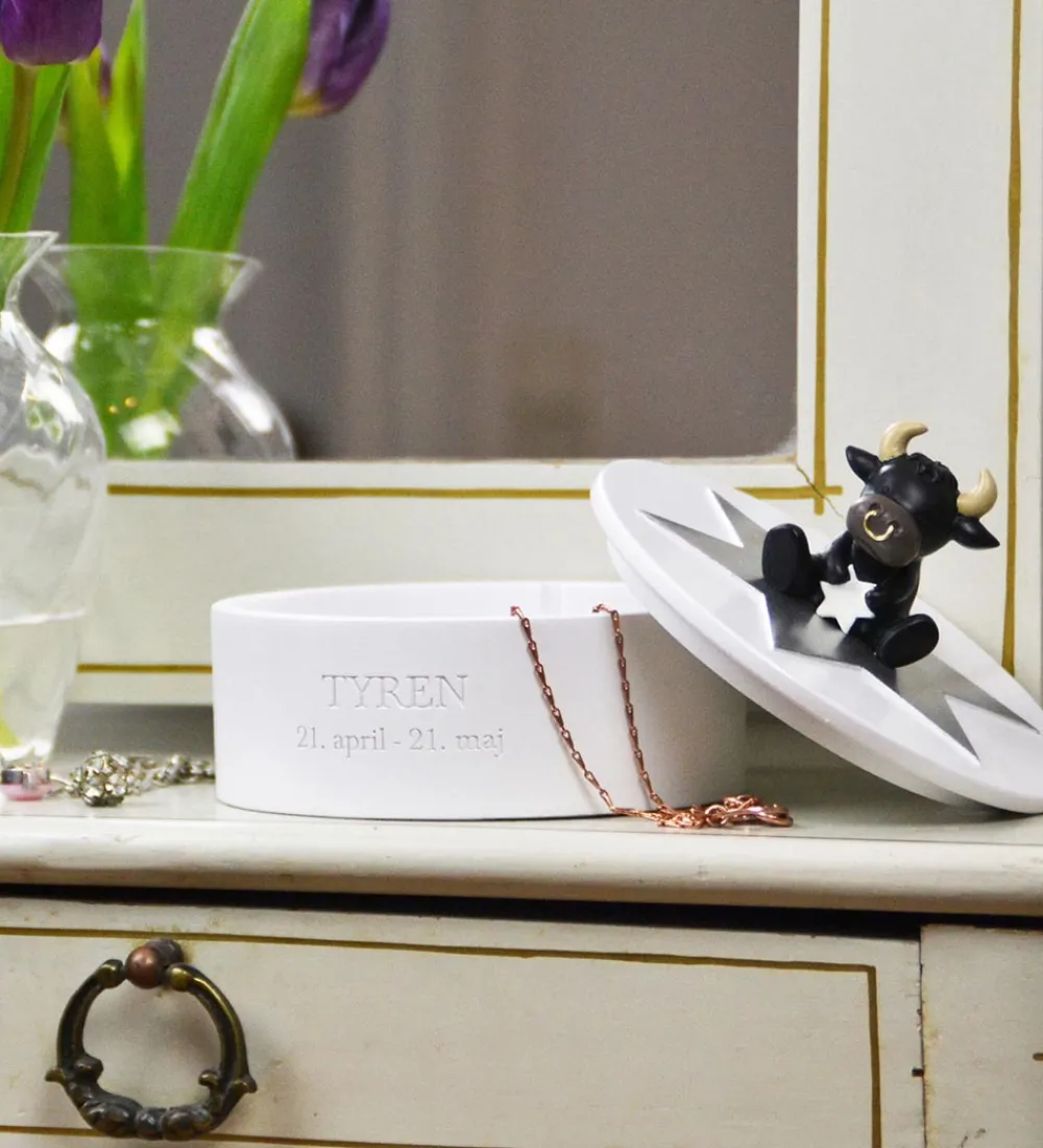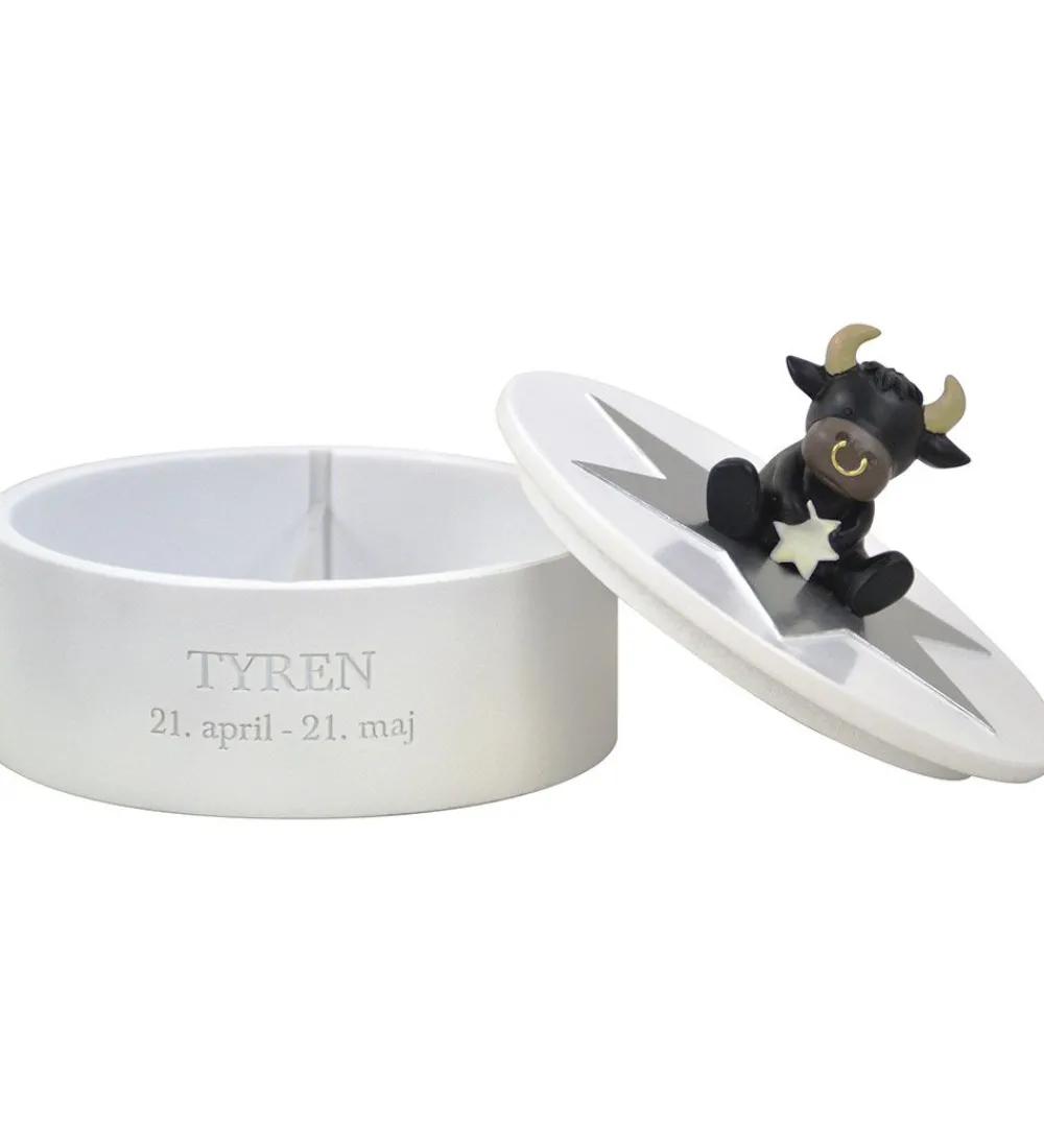 Flot Kids by Friis smykkeskrin i hvid med stjernetegnet Tyren. Ovenpå sidder en en sød figur, som skal illustrere stjernetegnet, og figuren holder en stjerne, der lyser i mørke. Fortil står der skrevet “TYREN” og stjernetegnets periode.