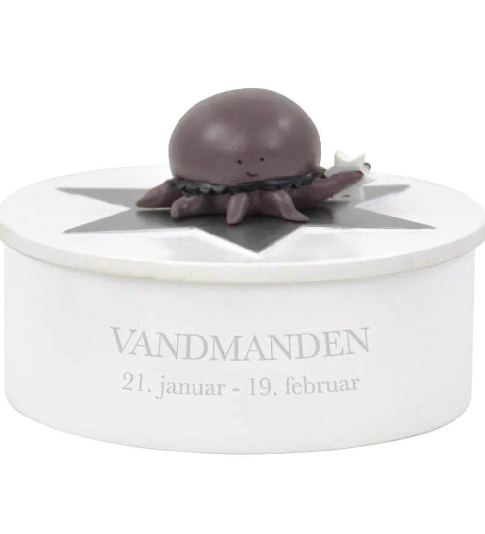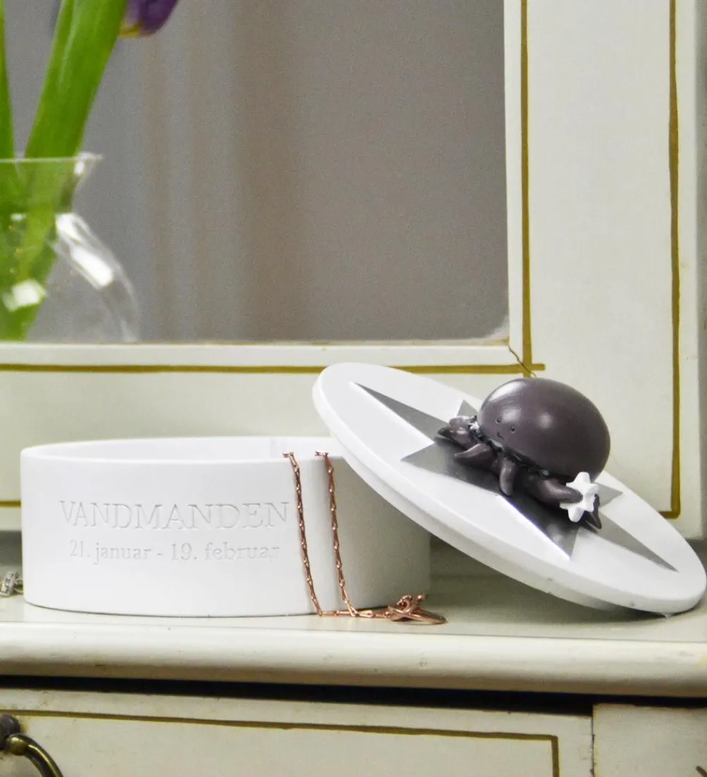 Flot Kids by Friis smykkeskrin i hvid med stjernetegnet Vandmanden. Ovenpå sidder en en sød figur, som skal illustrere stjernetegnet, og figuren holder en stjerne, der lyser i mørke. Fortil står der skrevet “VANDMANDEN” og stjernetegnets periode.