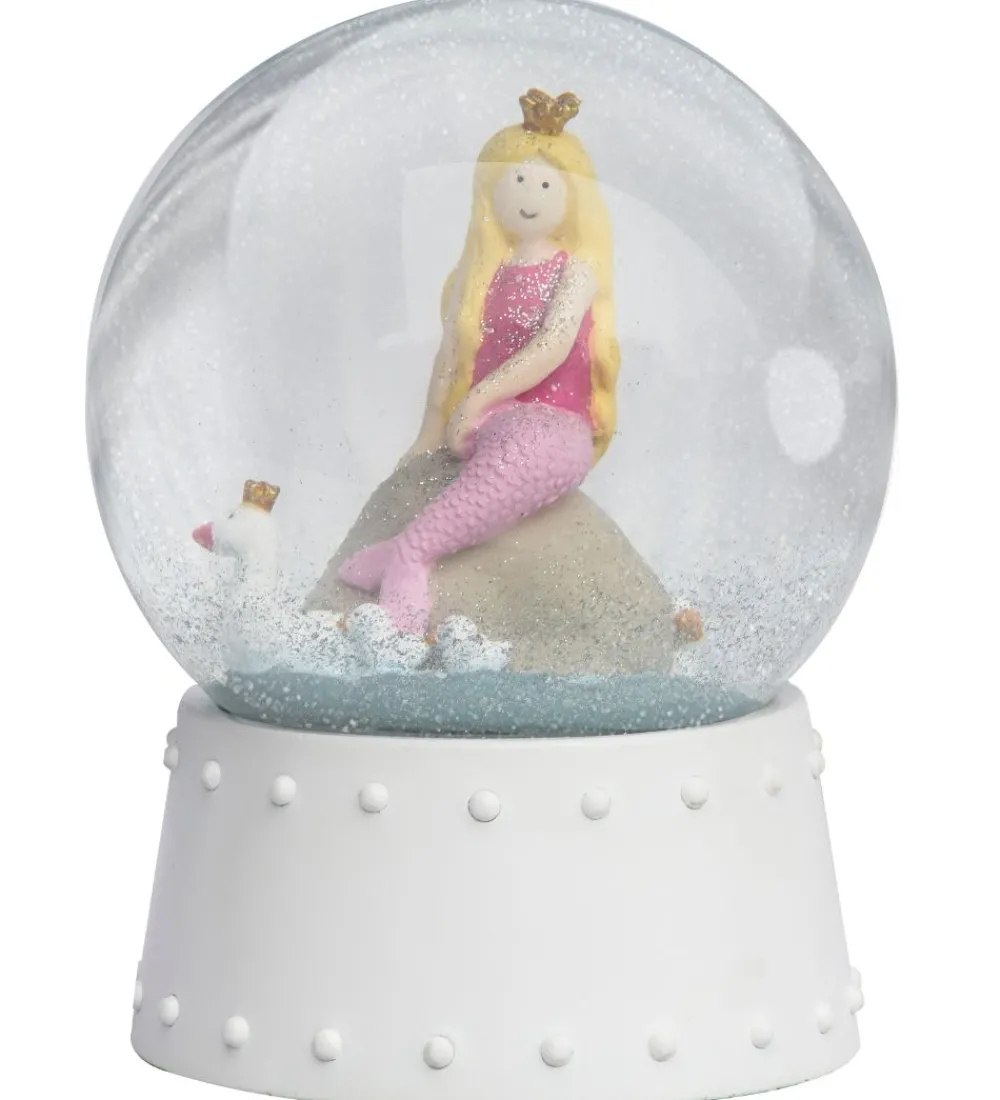Sød Kids by Friis snekugle med en bund i hvid med små, fine kugler. Inde i snekuglen sidder den lille havfrue på en sten i vandet med en prinsessekrone på hovedet.
