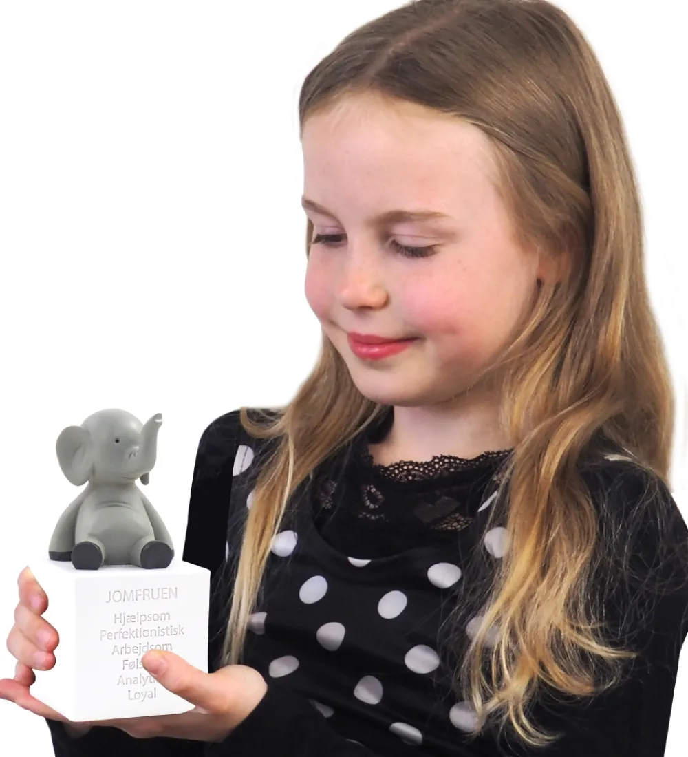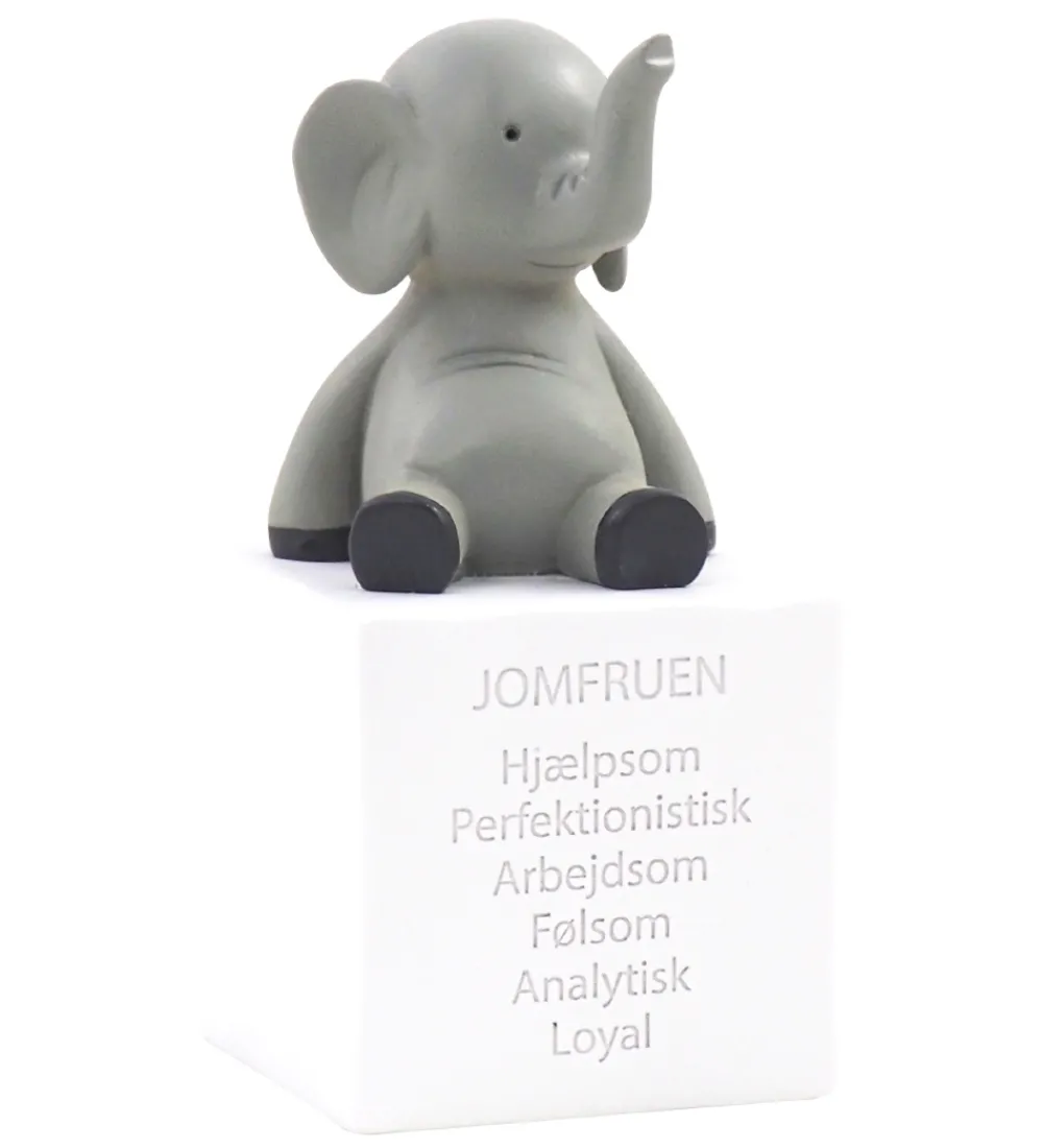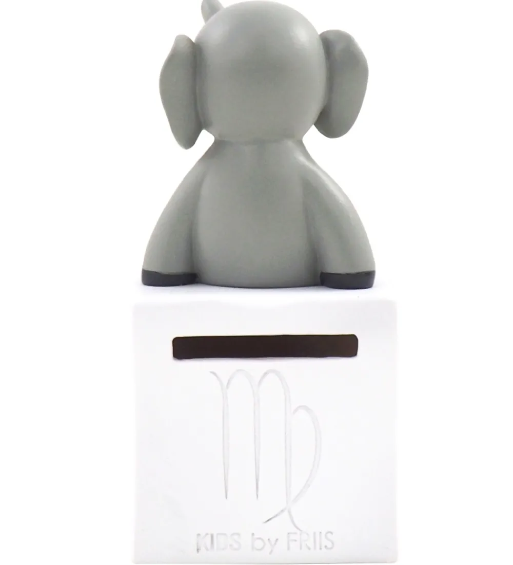 Skøn Kids by Friis sparebøsse med stjernetegnet Jomfruen. Der er en sød figur, som skal illustrere stjernetegnet, oven på selve sparebøssen, der er udformet som en hvid kube.