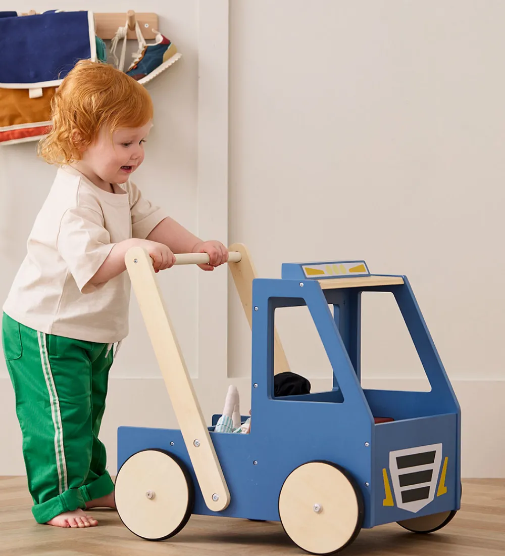 Flot Kids Concept gåvogn af træ i form af en blå lastbil.
