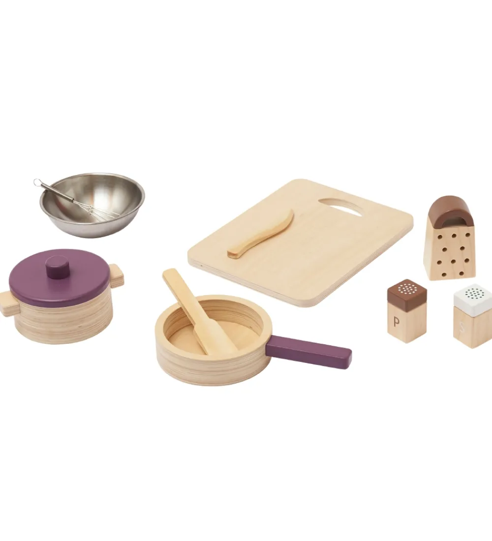 Skønt Kids Concept køkkensæt i træfarver, lilla og brun i et skadinavisk design.